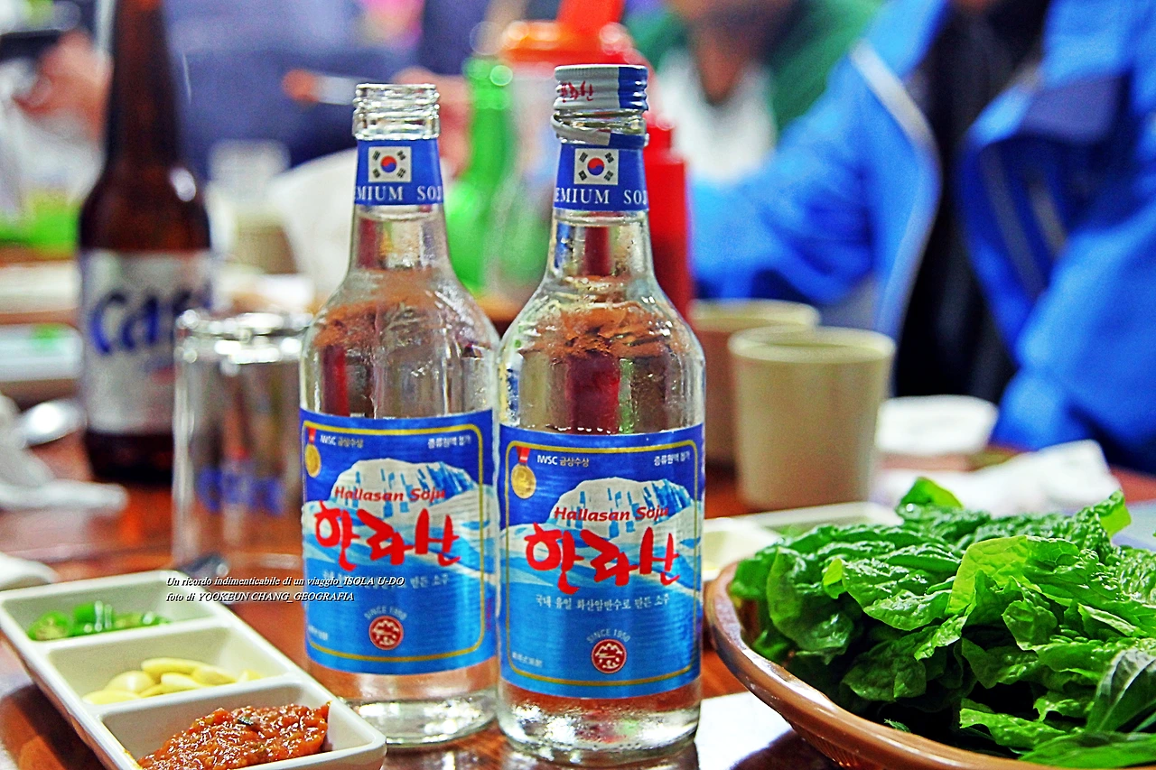 그리고 눈앞에 펼쳐진 제주산 한라산 소주... 흔히 맛볼 수 없는 물 좋은 제주 한림읍에서 생산되는 (희석식) 소주다. 고구마 주정에 약 78%의 물을 섞고 올리고당과 아스파라긴산을 첨가하여 제조한 것으로 알려졌다. 제주 시장의 약 92%를 점유하고 있는 한라산 소주는 제주의 대표선수이자 명물. 미국과 일본 등지로 수출되고 있는 술이란다. 한라산 소주의 연혁은 1950년부터라고 하므로 어느덧 73년째를 맞이하고 있는 것. 태극기가 그려진 브랜드 라벨이 독특했다.