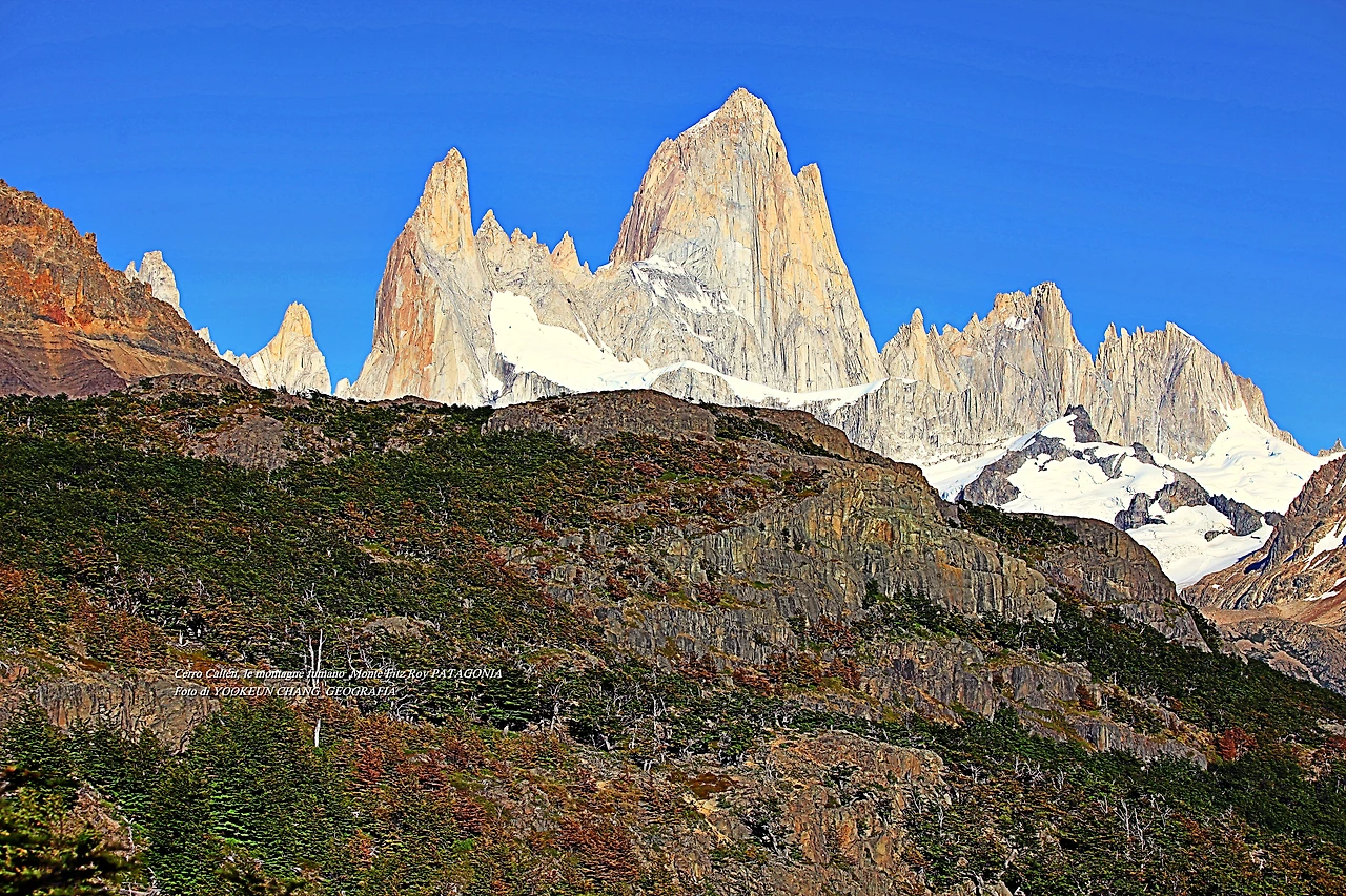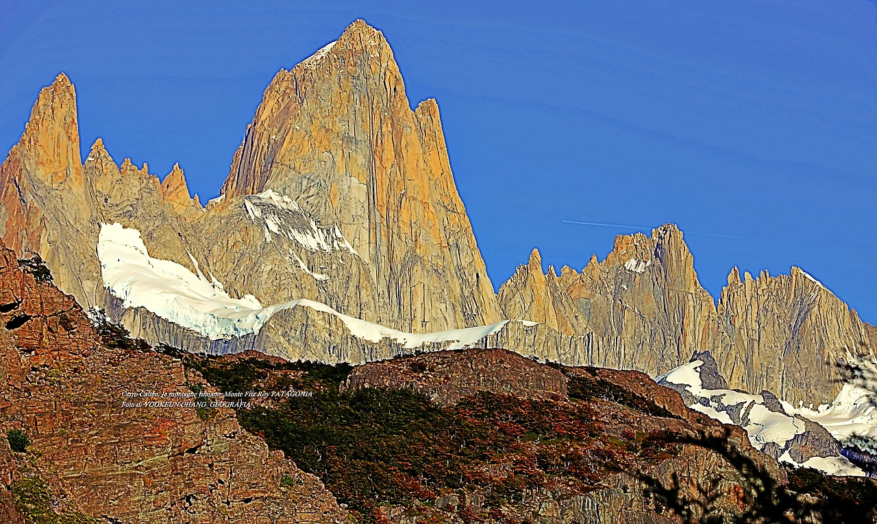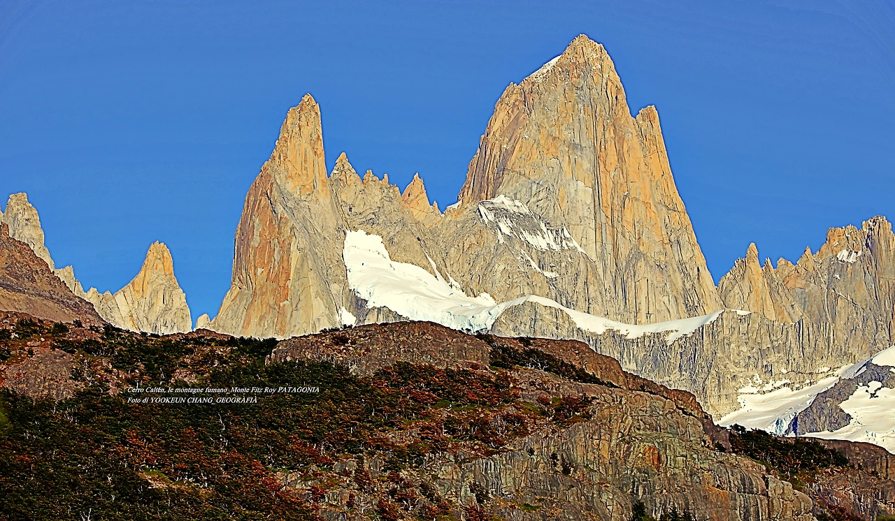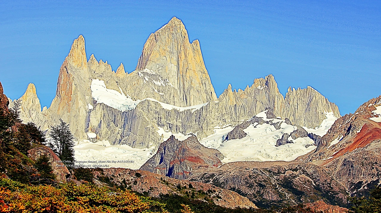 il parco nazionale Los Glaciares, nella provincia di Santa Cruz, e dalla parte cilena, forma parte del parco nazionale Bernardo O'Higgins. Raggiunge un'altezza di 3.405 metri sul livello del mare. 자료출처: https://it.wikipedia.org/wiki/Monte_Fitz_Roy