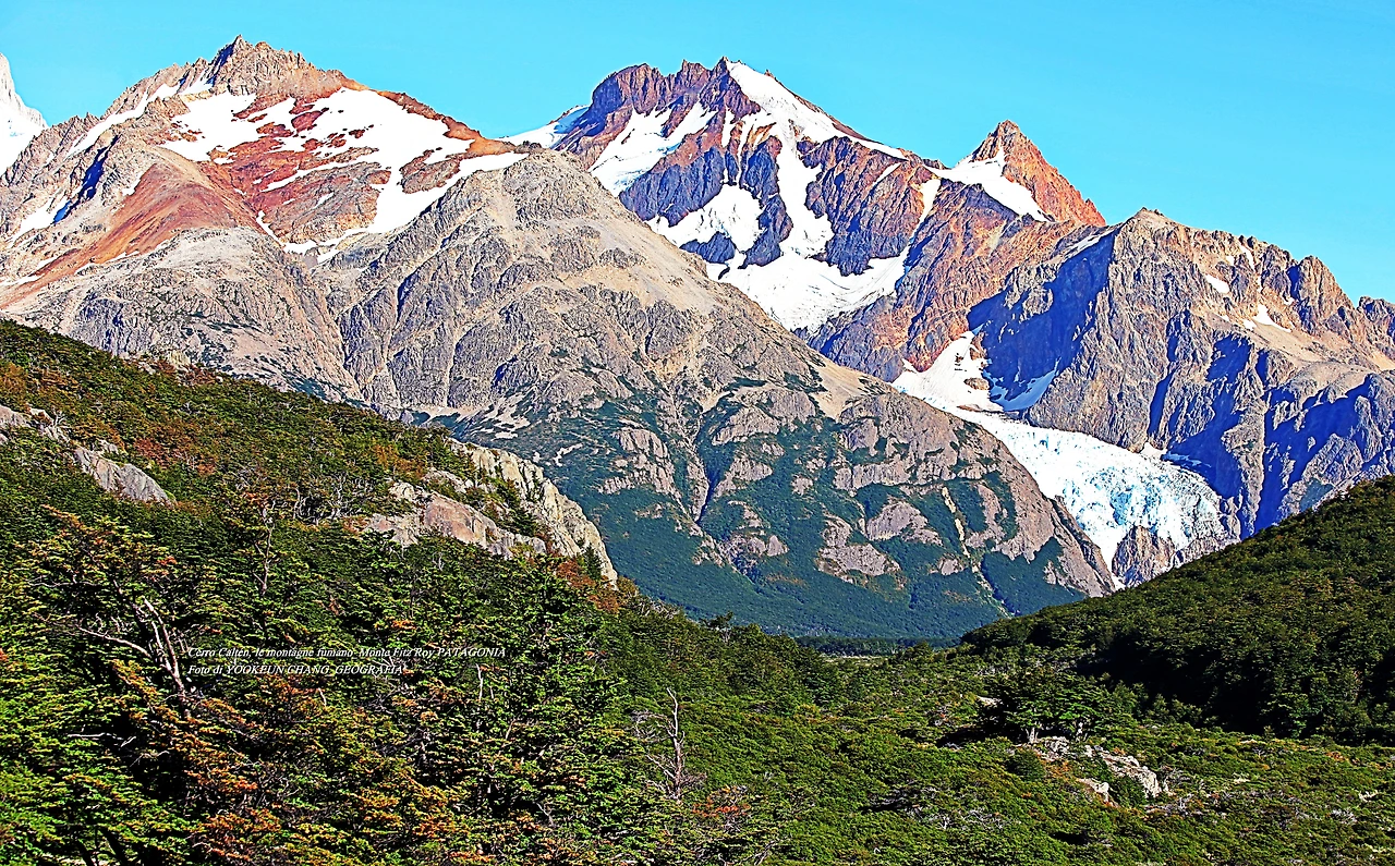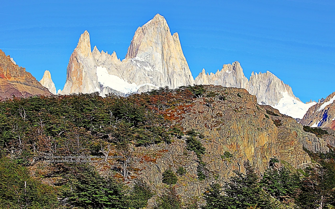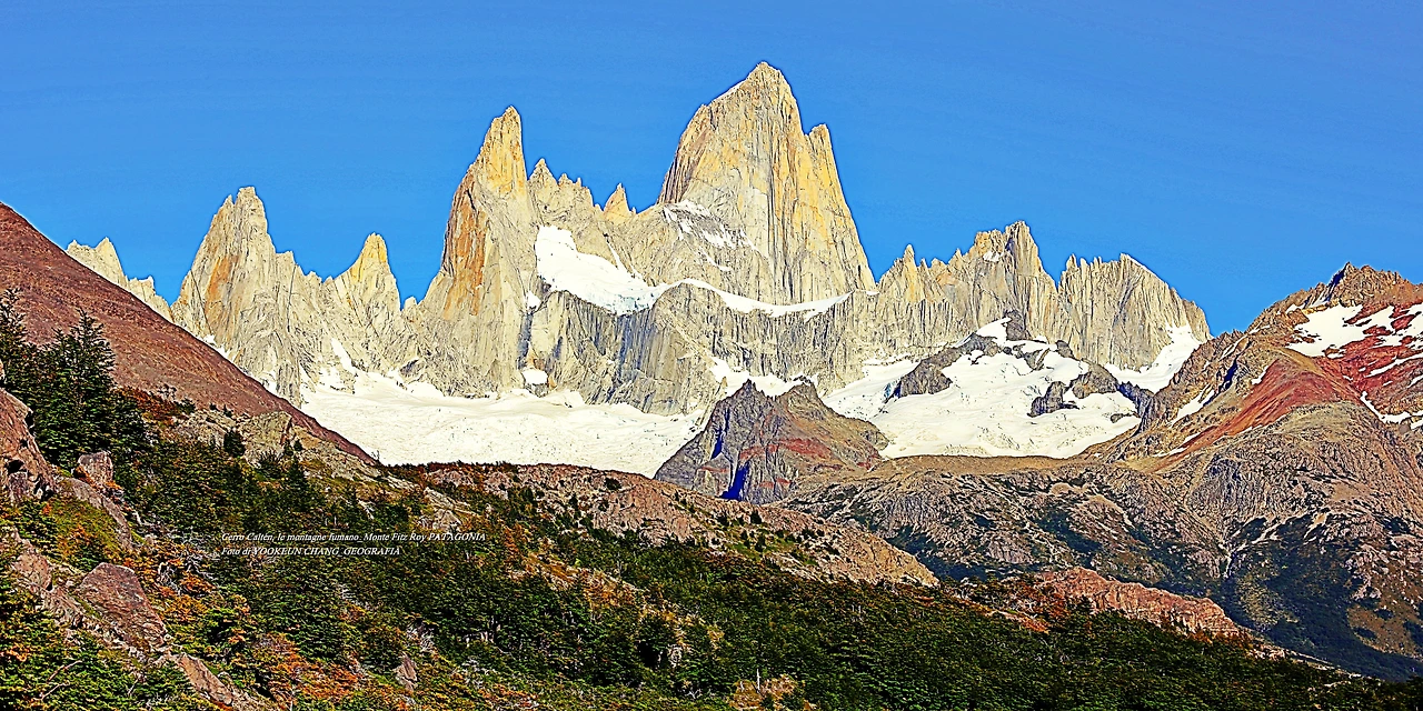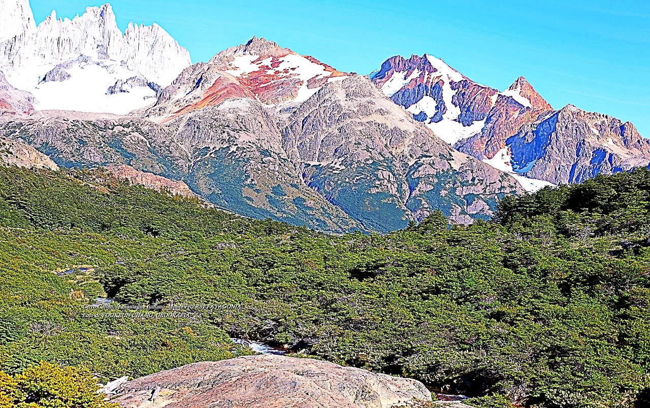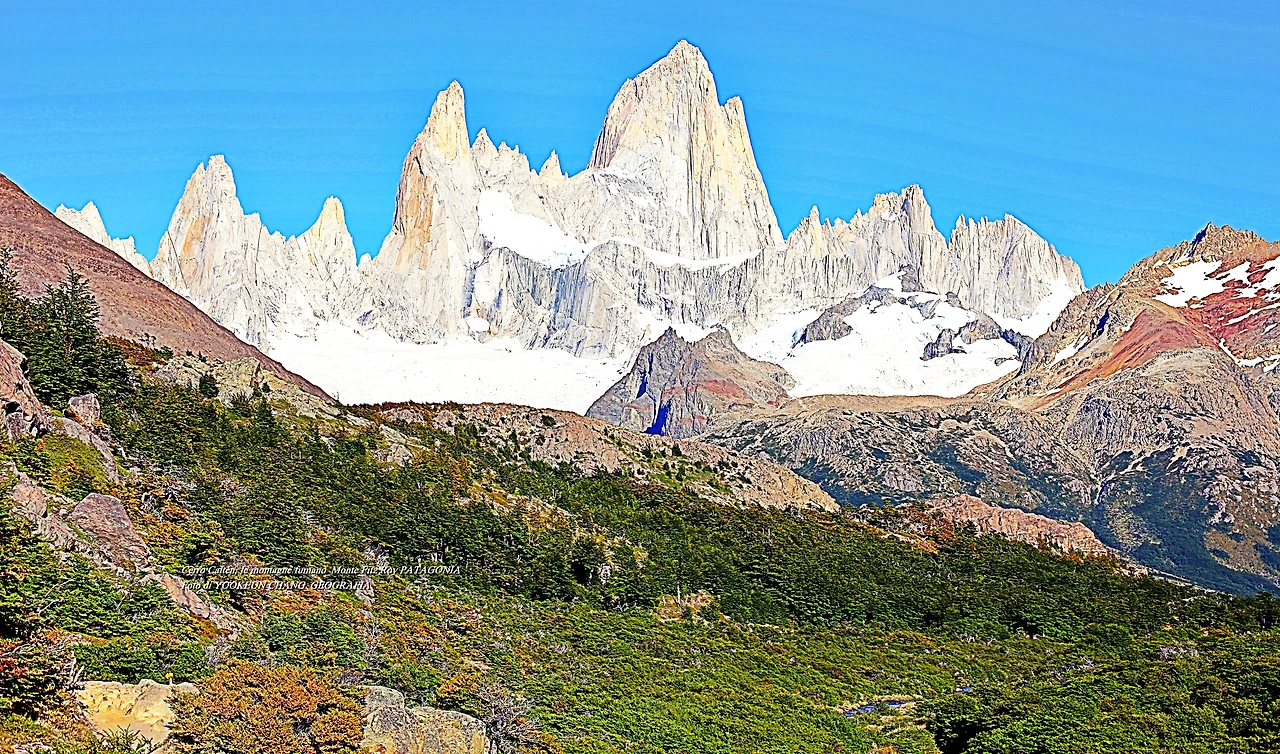 il parco nazionale Los Glaciares, nella provincia di Santa Cruz, e dalla parte cilena, forma parte del parco nazionale Bernardo O'Higgins. Raggiunge un'altezza di 3.405 metri sul livello del mare. 자료출처: https://it.wikipedia.org/wiki/Monte_Fitz_Roy