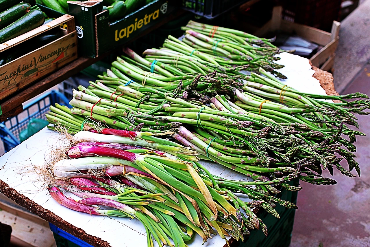 그리고 제철을 맞이한 아스빠라지(Asparago selvatico, 아스파라거스)가 시선을 붙든다. 아스빠라지의 효능은 칼로리와 나트륨 함량이 낮은 대신 섬유소가 많아 변비 예방과 다이어트에 제격이다. 콩나물 보다 10배 많은 아스파라긴산(Asparagina)은 숙취해소·피로해소·이뇨작용에도 탁월한 효과를 발휘하는 것으로 알려졌다. 또한 야채임에도 불구하고 풍부한 단백질을 함유하고 있어서 이맘때만 되면 불티나게 팔리는 채소 중 하나이다.