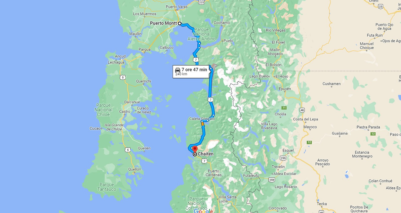위 지도를 참조하면 뿌에르또 몬뜨로부터 챠이텐까지 가리는 대략 240km이며 거의 8시간이 소요되는 거리라고 표시되어 있지만 실제로 더 많은 시간이 소요되는 곳이다. 여행 당시를 생각하니 까마득 하지만 엊그제 다녀온 듯 생생한 건 또 뭔가..