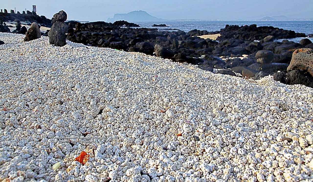 하우목동항구응 지나 해변도로를 벗어나 바닷가로 내려서면 서빈백사의 특별한 해변과 바다가 연출된다. 에메랄드빛으로 부서지는 햇살 아래 하얗다 못해 푸른빛이 감도는 서빈백사해변.. 우도 서쪽의 하얀 모래해변이라 하여 서빈백사로 불리는데.. 이곳의 모래는 해양 조류 중 하나인 홍조가 해안으로 쓸려와 퇴적된 것으로, 홍조단괴 산호해변으로도 불린다. 뷰파인더 가득 채운 작은 돌멩이(?)들이 서빈백사를 이루고 있는 홍조단괴란 녀석들..