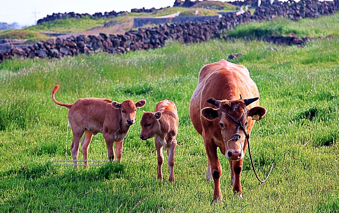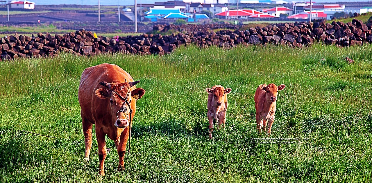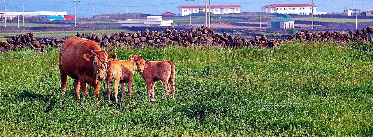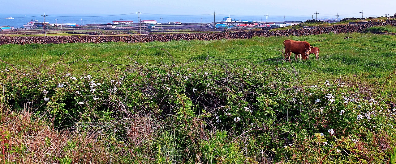 어느 날 우도 여행 중에 만난 어미 소 한 마리와 송아지 두 마리가 찔레꽃 덤불너머에서 풀을 뜯고 있었다. 어미 소는 낯선 이방인의 출현에 풀을 뜯다 말고 경계모드로 돌입했다. 곁에 있던 송아지 두 마리의 표정도 어미를 닮았다.