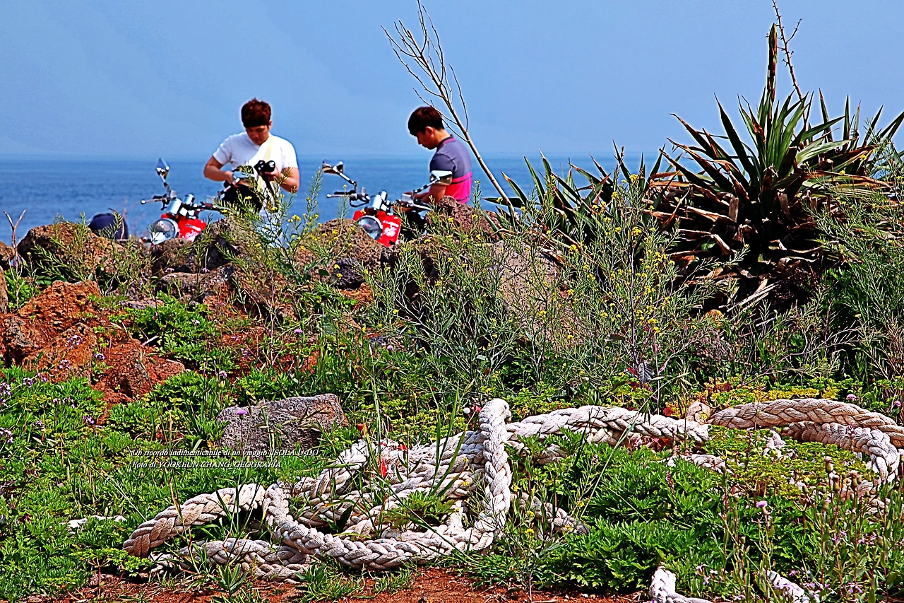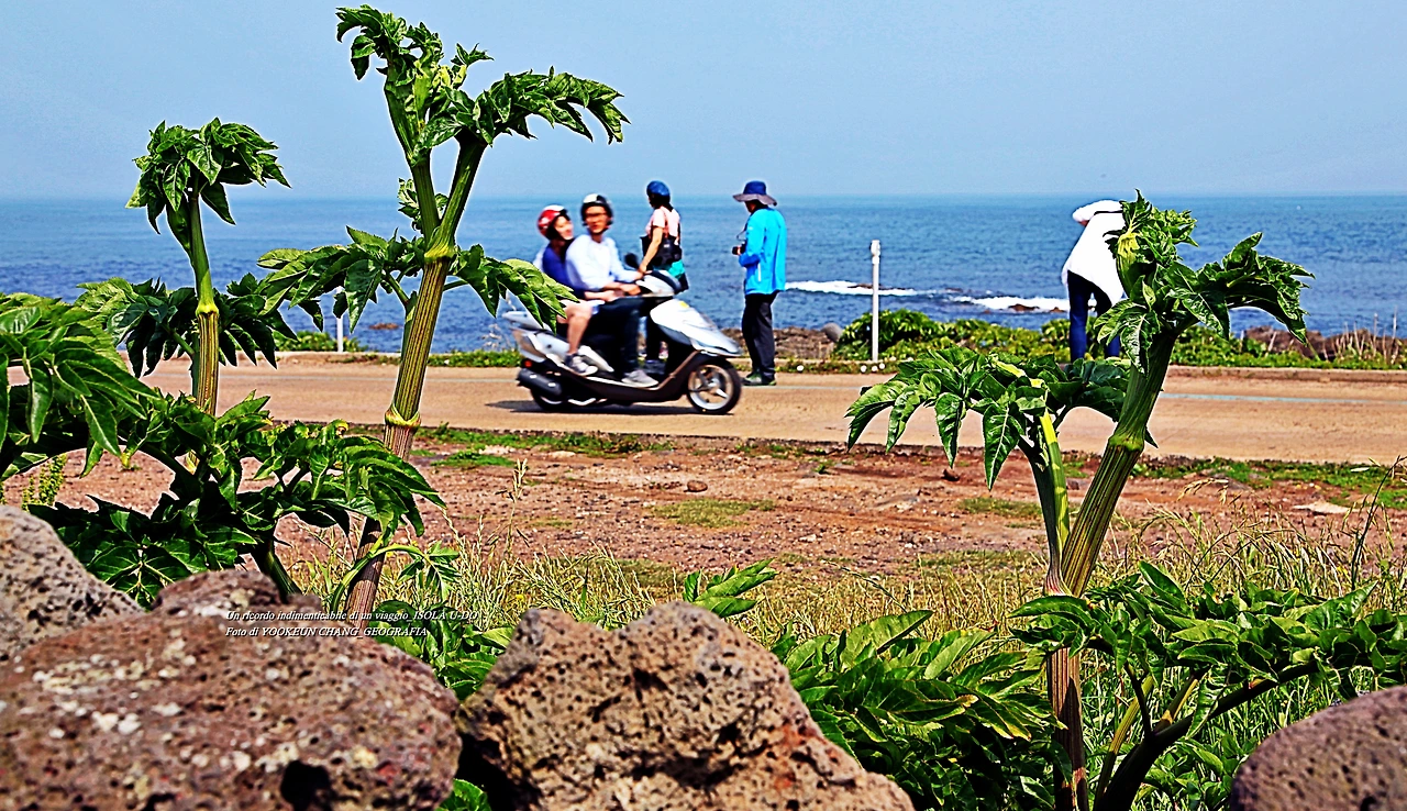 두 청년이 우도의 순환도로 곁에서 오토바이를 장차해 놓고 카메라를 만지작 거리고 있다.