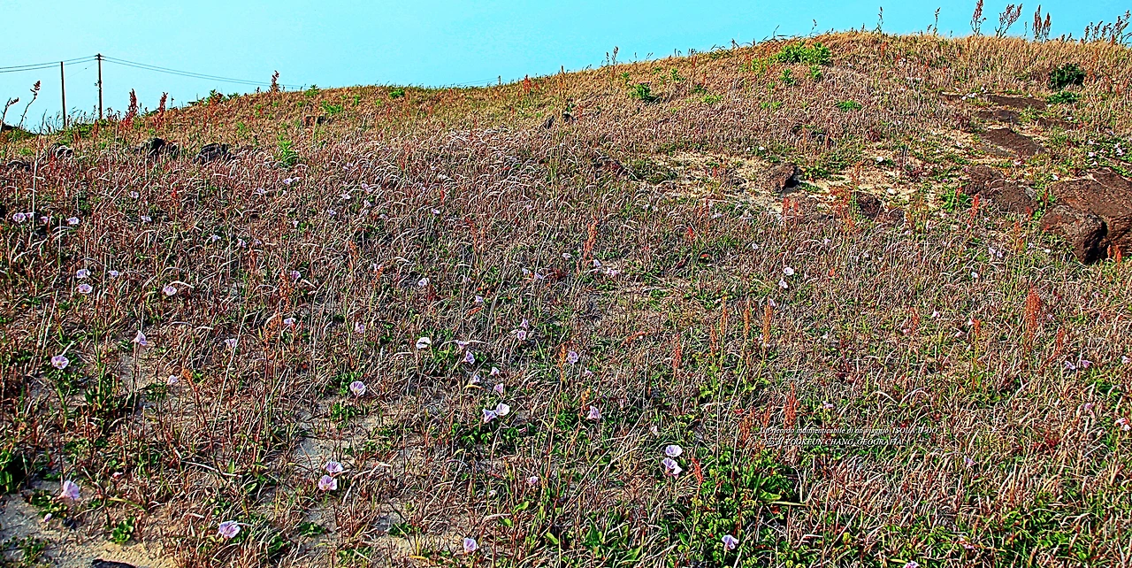 그 가운데 우도 여행을 행복하게 만들어준 풍경이 따로 있었다. 갯메꽃(Soldanella di mare_Calystegia soldanella) 군락지였다. 우리나라 각처의 해안가에서 자라는 덩굴성 다년생 초본으로 갯메꽃은 메꽃과 닮기는 하였으나, 다른 점이 있다면 꽃이 더 작은 것이 메꽃과 갯메꽃의 차이이다.
