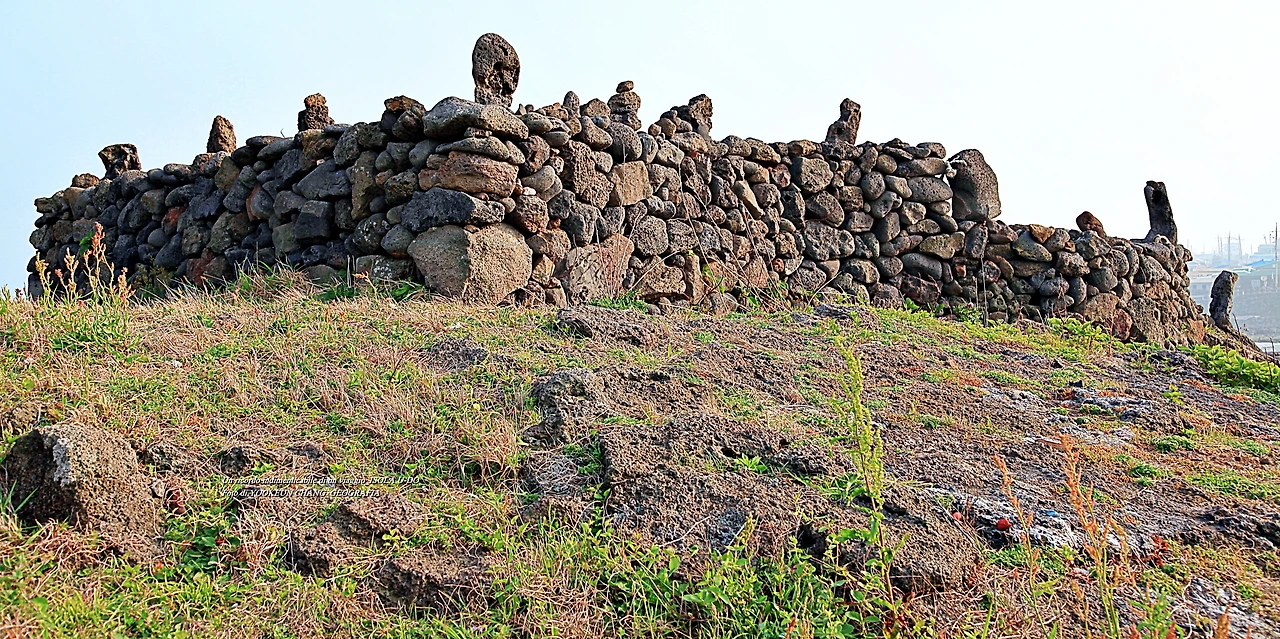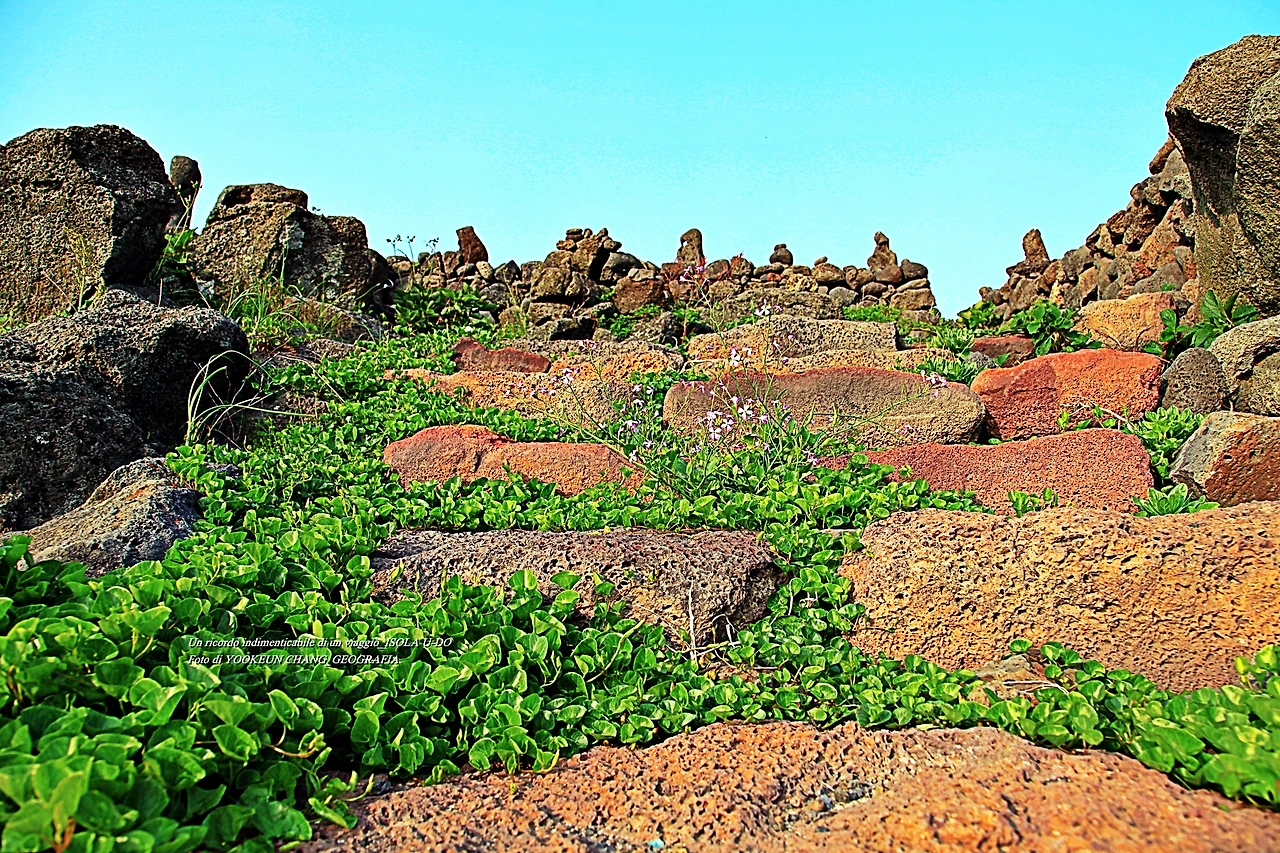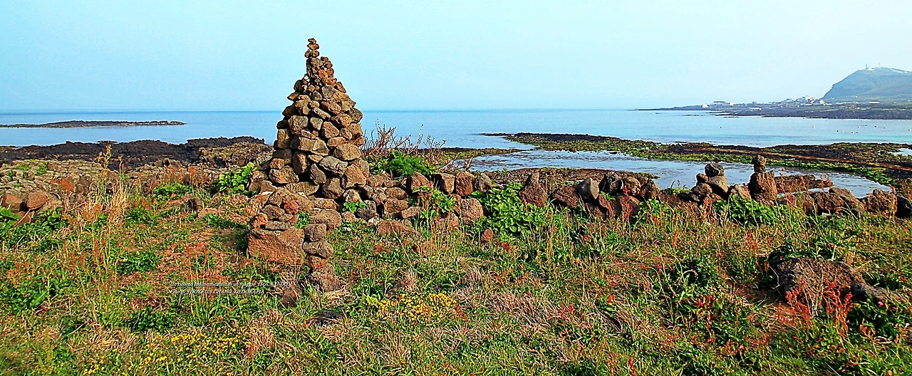 큼지막한 현무한 돌계단을 쌓은 비양도의 제단은 이렇게 생겼다. 제단 틈바구니에는 갯메꽃 이파리들이 옹기종기 자리 잡고 있었으며 제단이 바라보고 있는 방향은 우도 조일리 비양동 방향이다.
