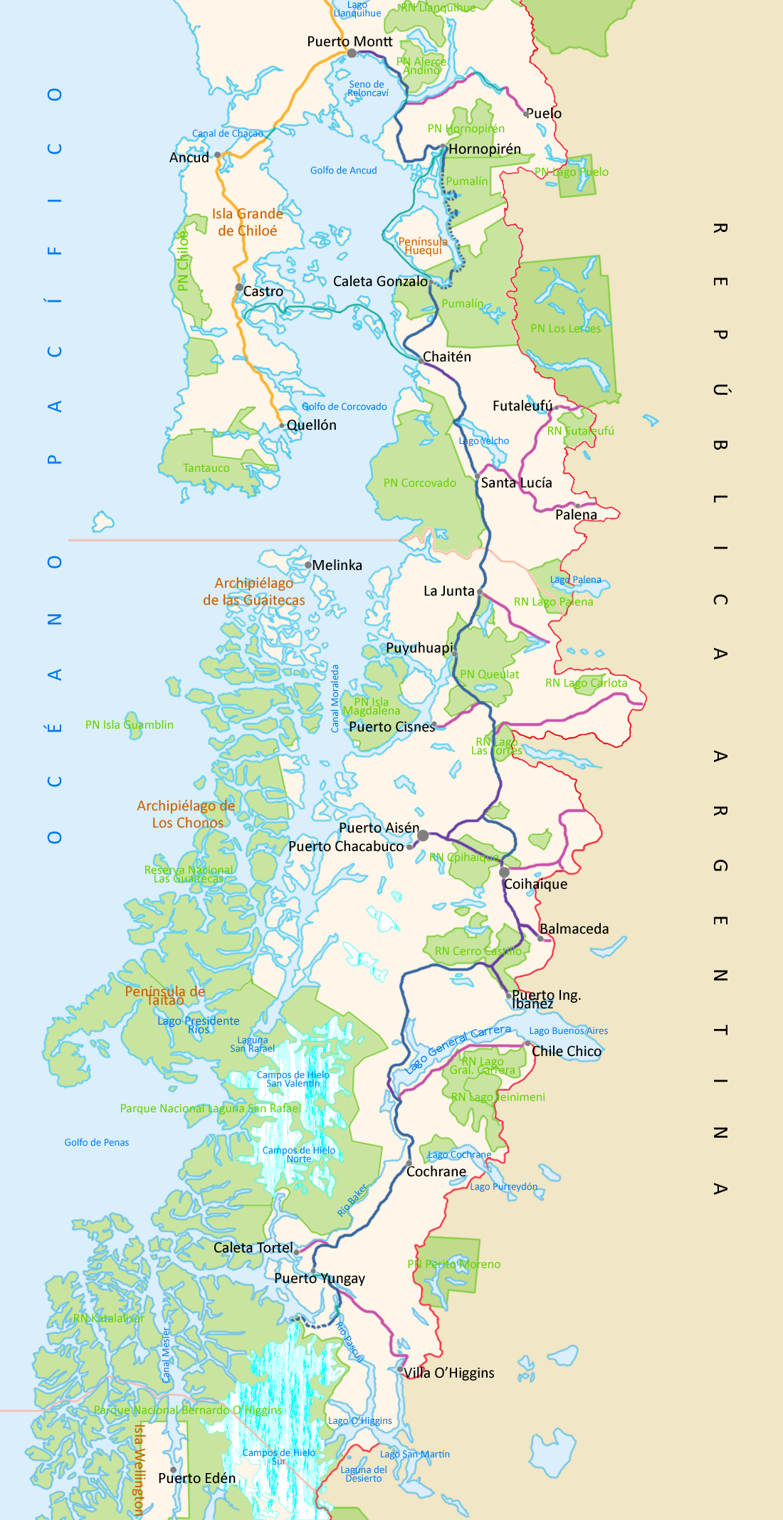 우리 독자님들과 이웃분들을 위해 다시 한번 더 현재 위치를 개관해 본다. 관련 포스트에서 '흙 없는 마을'이라 소개한 이 마을 뒷산에 오르면 리오 꼬끄랑(Río Cochrane) 강 하류와 파타고니아 깊숙한 곳에 위치한 칠레의 피오르드 협만이 합류하는 곳이다. 참고로 칠레의 아이센 주에 위치한 리오 꼬끄랑의 지도를 살펴보면 이러하다.