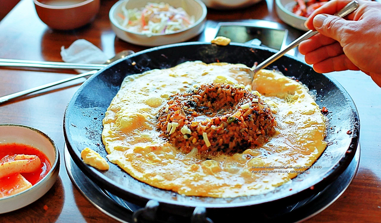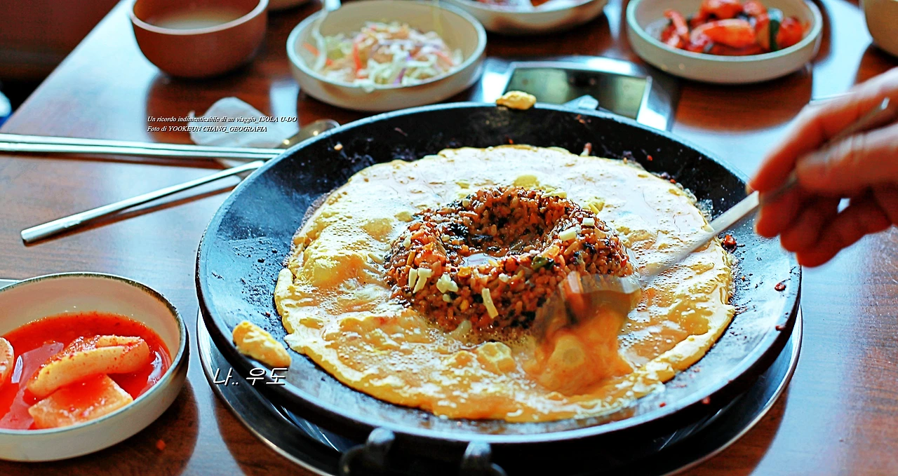 볶음밥과 함께 어우러진 계란이 모락모락 김을 피우고 있다. 마치 화산이 생성될 때 같은 풍경.. 제주도 본섬에 떠밀려 한쪽에 위치한 우도가 앙증맞기 이를 데 없다.