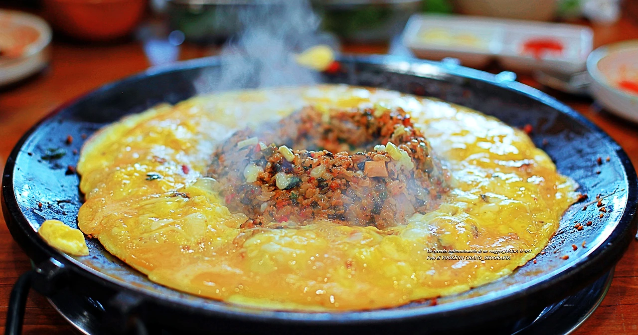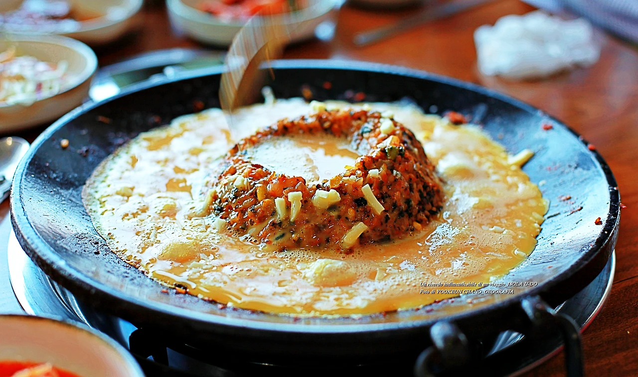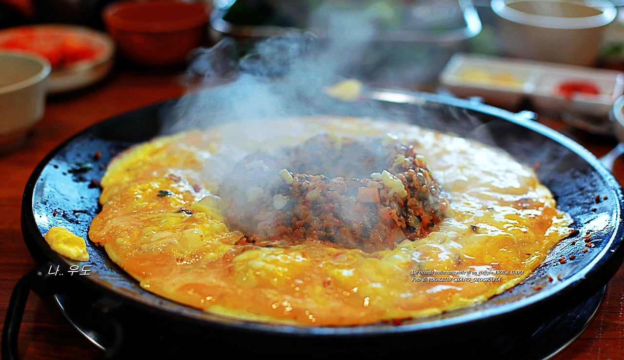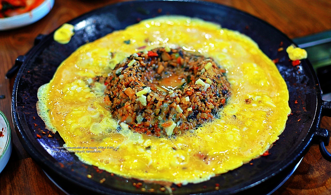 제주도가 위에서 내려다보면 동쪽에서 서쪽으로 긴 타원형을 이루고 그 가운데 한라산이 솟아 있습니다. 제주도 본 섬은 1차 화산활동 때 생겨난 분화구고요. 그 외에 우도 마라도 가파도 비양도 등 작은 섬들은 2차 화산활동 때 수 차례의 화산활동으로 생겨났다고 합니다....... 약 2분 정도 있다가 드시면 되고요. 드실 땐 섞지 마시고 계란찜 반 볶음밥 반반씩 섞어서 드시면 됩니다."