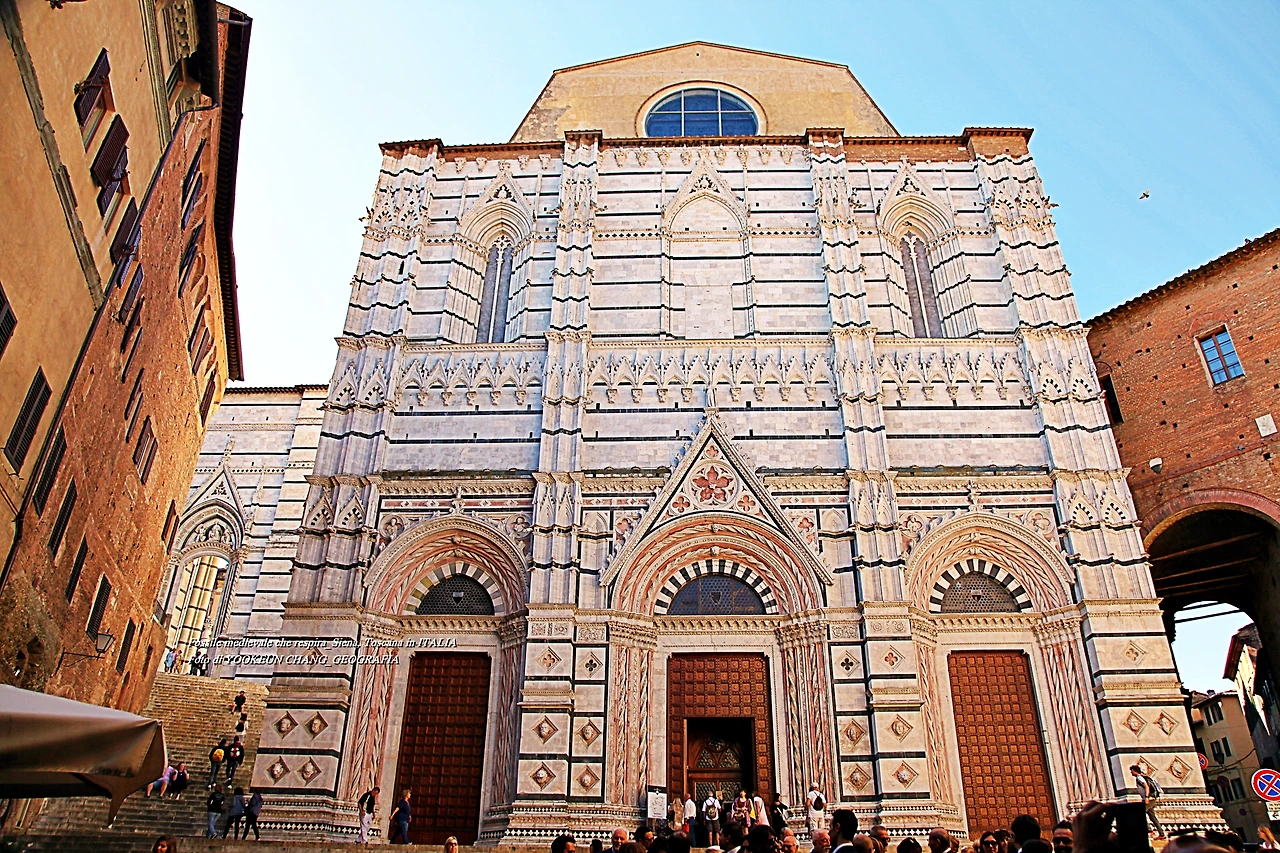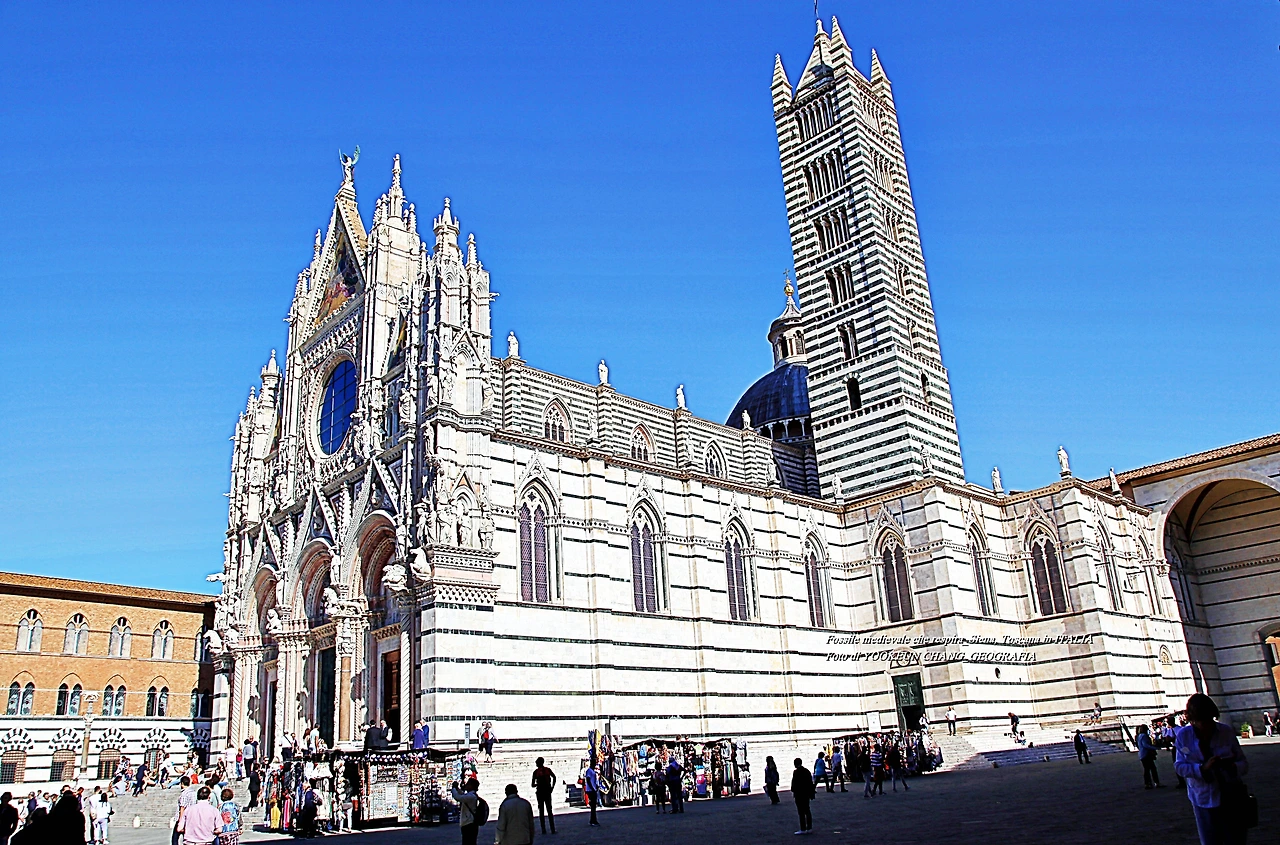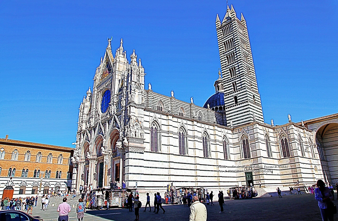 Il Duomo di Siena, la cui mole si innalza nella omonima piazza, costituisce uno degli esempi più insigni di cattedrale romanico-gotica italiana. Secondo la tradizione, quella attuale sostituisce una prima chiesa dedicata a Maria, eretta intorno al sec. IX, sorta nel luogo in cui si trovava un tempio offerto a Minerva.