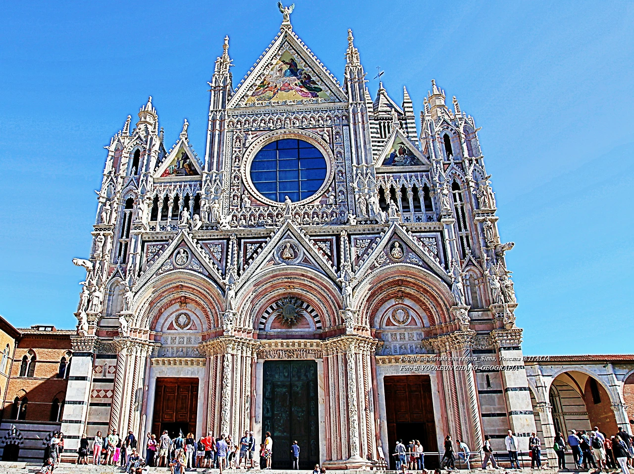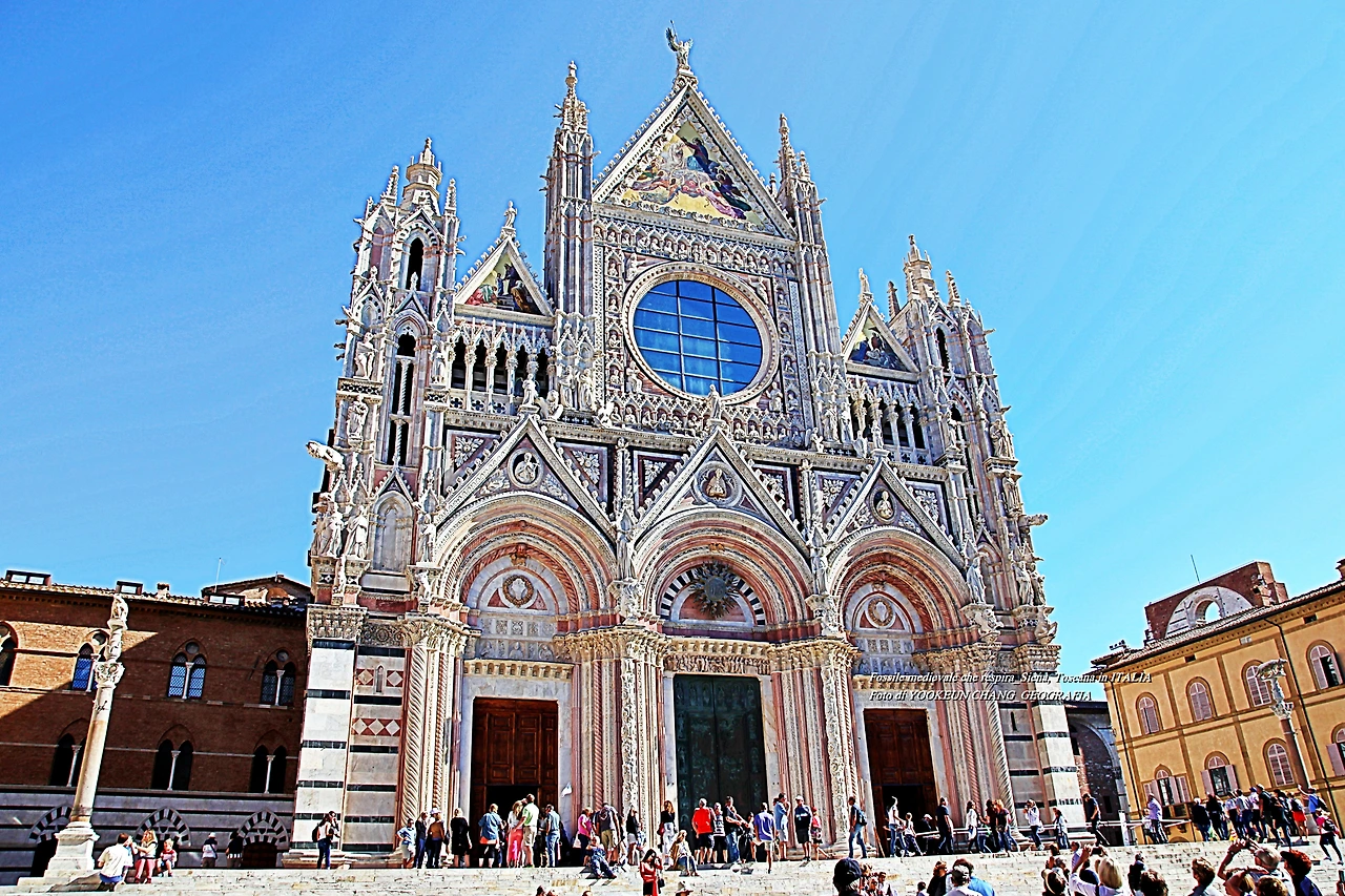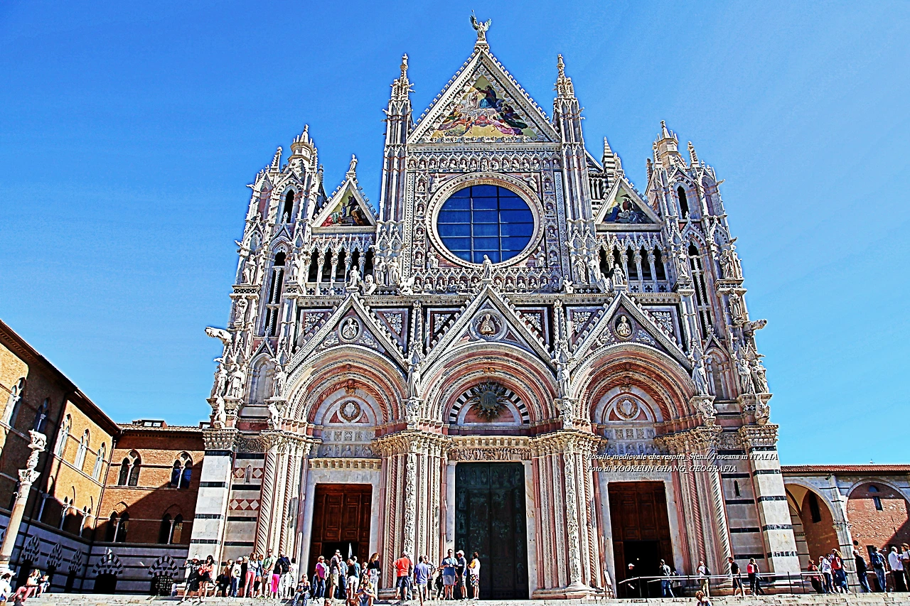 Il Duomo di Siena, la cui mole si innalza nella omonima piazza, costituisce uno degli esempi più insigni di cattedrale romanico-gotica italiana. Secondo la tradizione, quella attuale sostituisce una prima chiesa dedicata a Maria, eretta intorno al sec. IX, sorta nel luogo in cui si trovava un tempio offerto a Minerva.