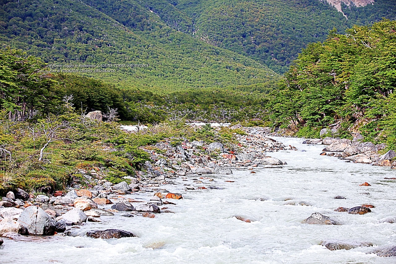 지도에서 지형을 눈여겨보시기 바란다. 자료사진의 현재 위치는 리오 피츠로이(Rio Fitz Roy) 강이며 엘 찰텐 마을 어귀를 돌아 라스 부엘타 리버(Las Vueltas River)와 합류하여 비에드마 호수(lago Viedma)로 흘러간다.