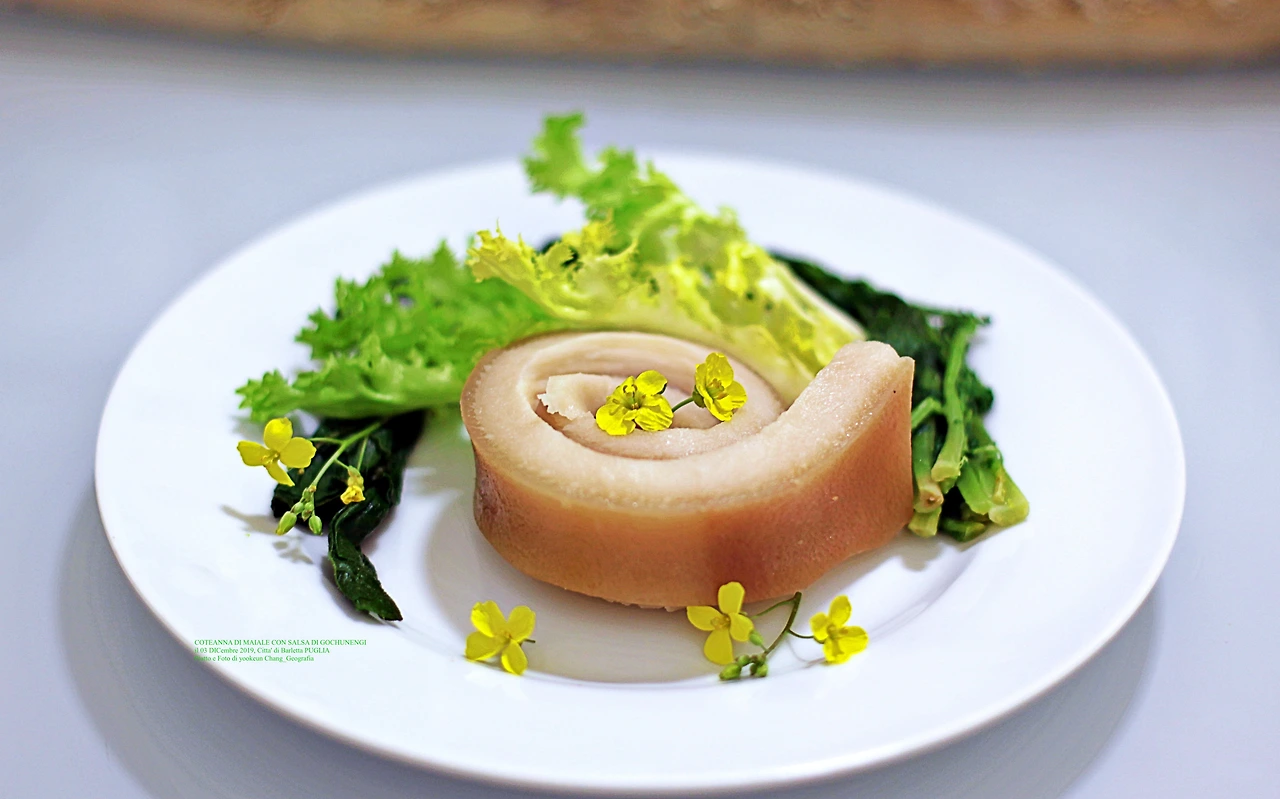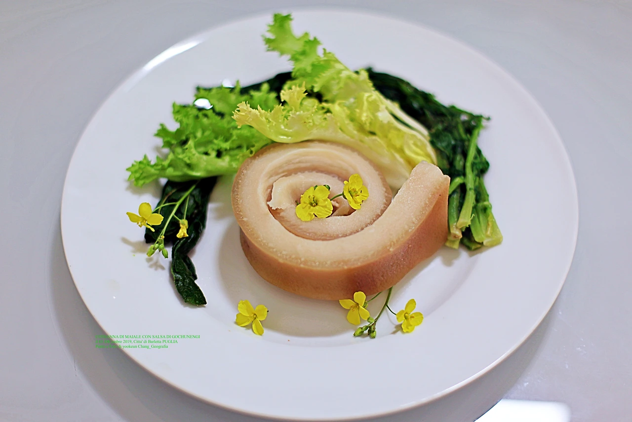 이날 만든 돼지 껍데기 요리는 작게 잘라 살사 디 고추냉이에 찍어 야생 열무와 상추에 곁들여 먹었다.