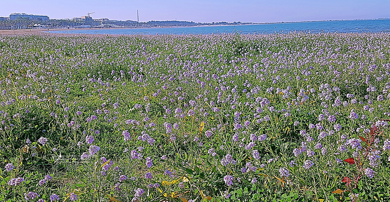 서기 2019년 12월 8일 정오경, 조금 늦은 아침운동을 끝마치고 바를레타 해변의 풍경을 담았다. 해변은 온통 알록달록한 풀꽃으로 물들었다. 바닷가에 가까운 곳은 연보랏빛으로 물들어 일대 장관을 이루는 곳. 한국은 영하의 날씨를 보이는 가운데 이곳은 영상 15도씨의 온도를 보이면서 마치 봄이 온듯한 풍경이다. 지난 몇 주 동안 짓궂은 날씨를 보이며 겨울을 재촉하는가 싶었더니 한 며칠 날이 맑게 개이면서 바다에서 가까운 해변은 풀꽃들이 피어나기 시작한 것이다.