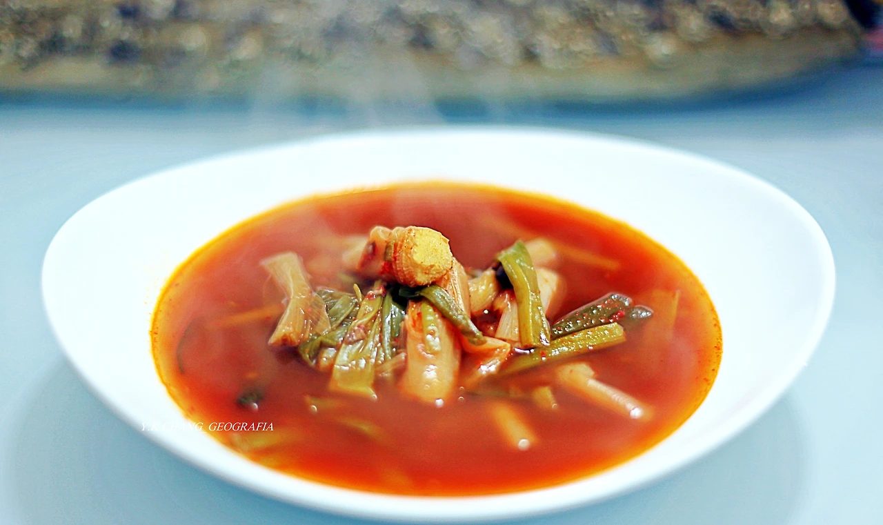 여기에 물 500cc를 붓고 끓인 다음 마지막으로 고춧가루 두 큰 술을 첨가했다. 그리고 한소끔 끓인 다음 불을 껐다. 장어 맛을 낸 대파 쥬빠(Zuppa di Porri con Anguilliformes)가 완성된 것이다. (위 자료사진)