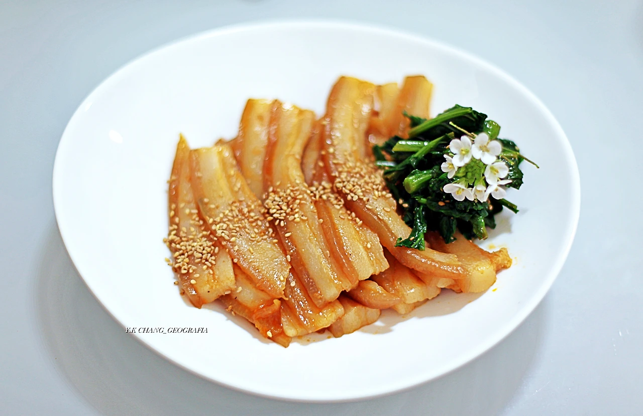 오늘의 돼지 껍데기 요리 리체타를 소개해 드리기 전에 먼저 위 자료사진 한 장을 설명해야 순서인 것 같다. 은은한 갈색빛이 도는 먹음직스러운 돼지 껍데기 요리에 사용된 식 재료는 분명히 돼지 껍데기가 맞다. 그런데 우리나라에서 봐 왔던 것과 적지 않은 차이를 보이고 있다. 삼겹살을 닮았다.