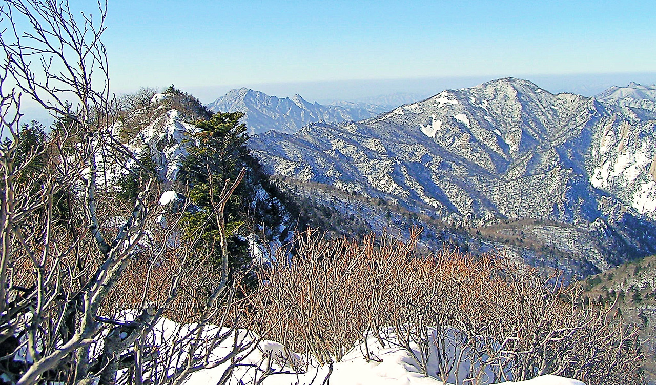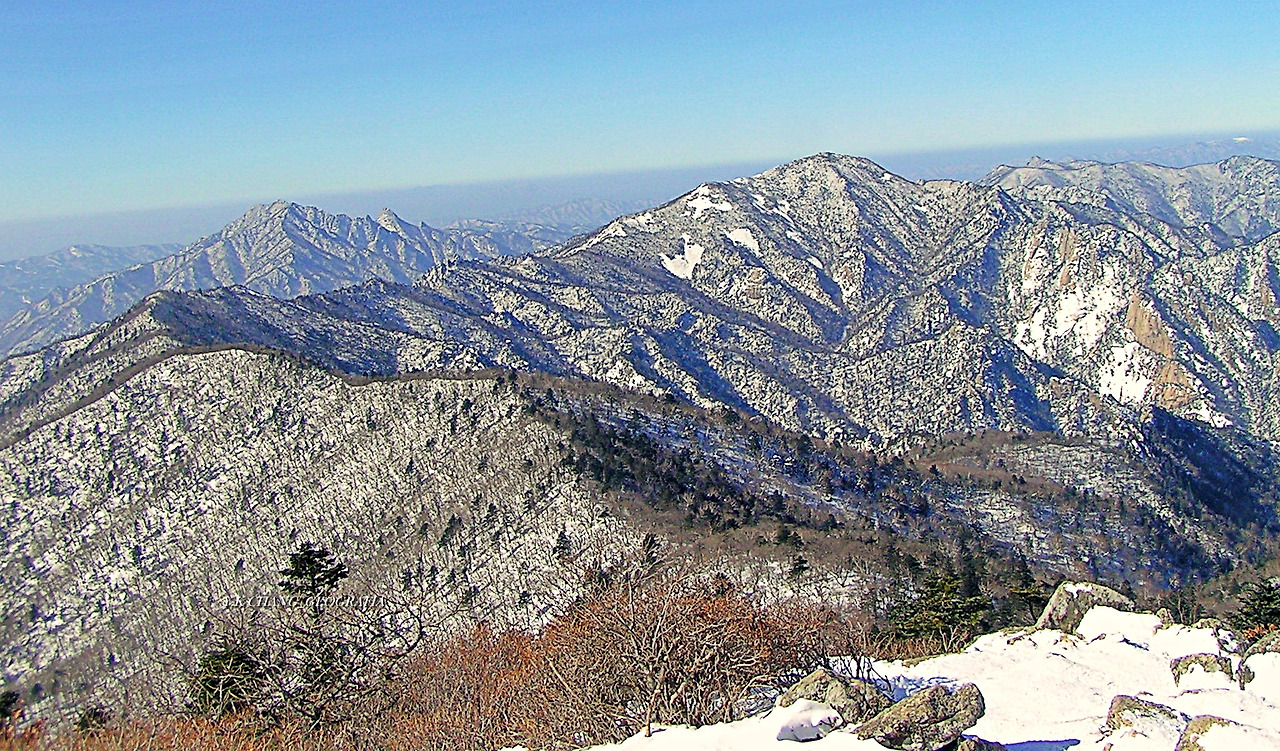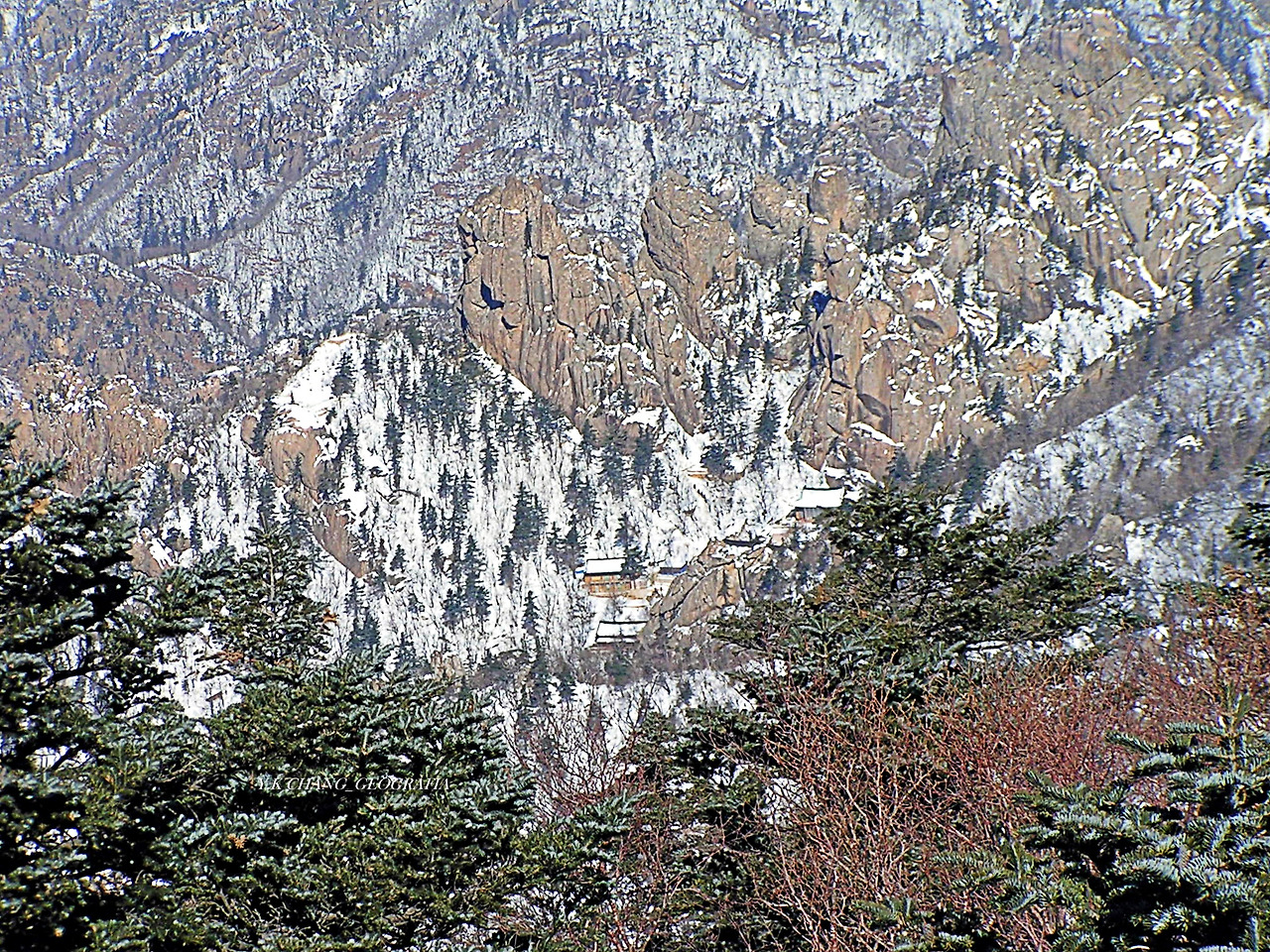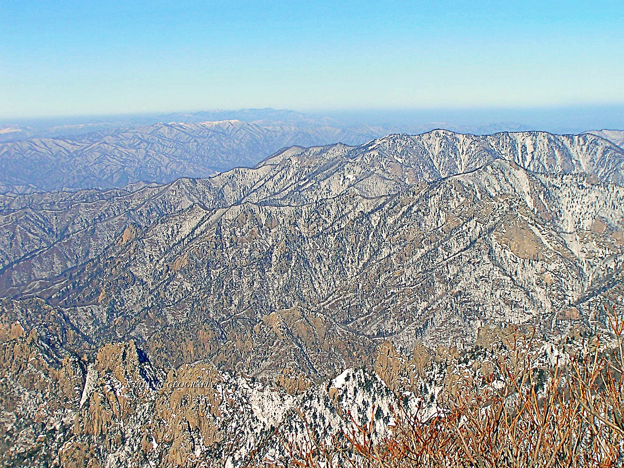 끝청 능선에서 바라본 내설악 봉정암의 눈 덮인 모습