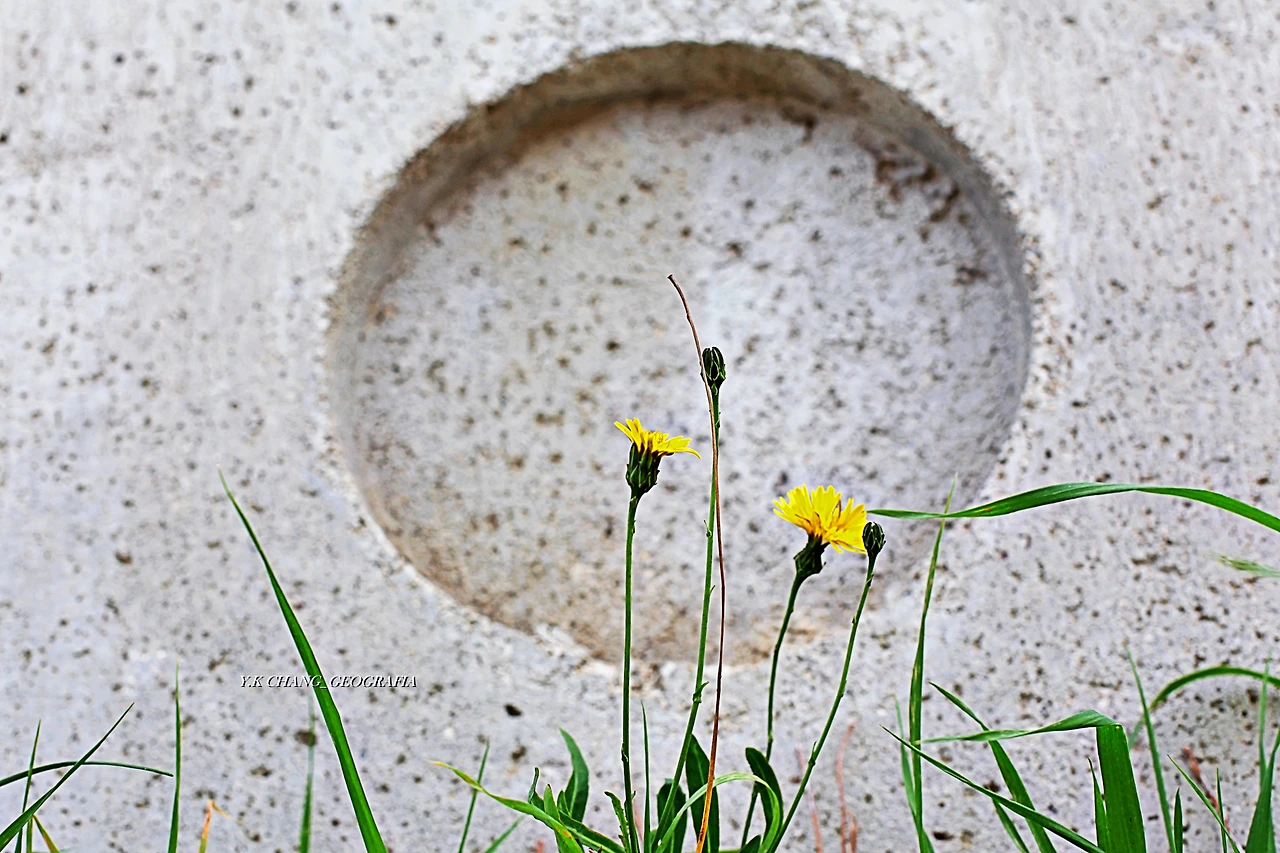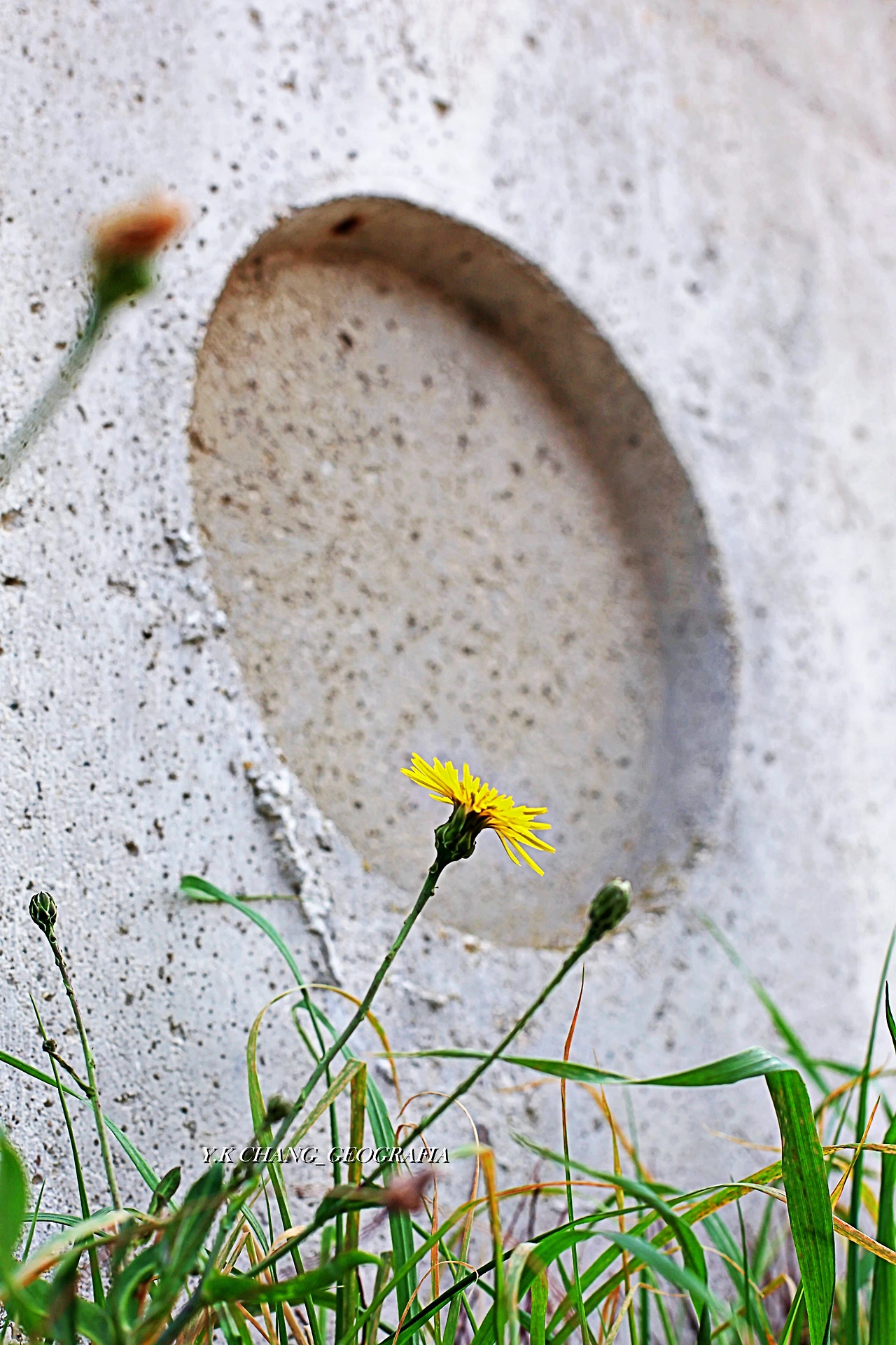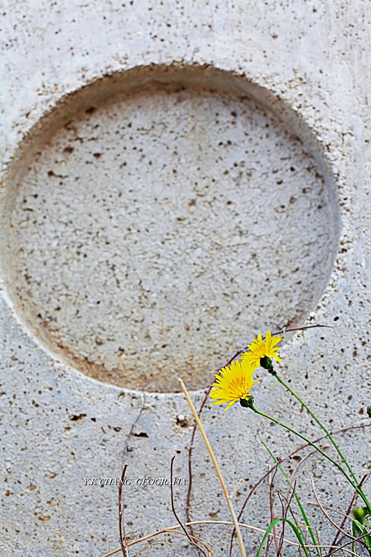 풀꽃 뒤의 구조물에는 동그란 홈이 파여 있었다. 절묘한 조화였다. 동그랗게 팬 홈이 잠시 잊고 살던 정월 대보름의 둥근달을 떠올린 것이다. 100미터 정도 이어지는 구조물 앞에 이 같은 풍경이 몇 번 이어졌다. 그 장면을 카메라에 담으며 오래전 정월 대보름 날의 추억을 건지게 된 것이다. 하마터면 잊고 지나칠 뻔한 추억들을 일깨워 준 고마운 풍경들..