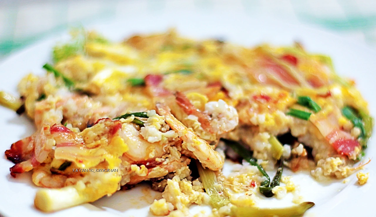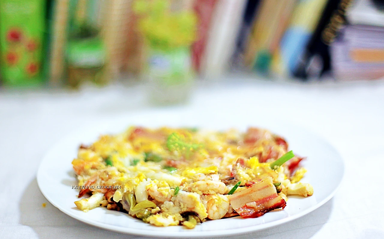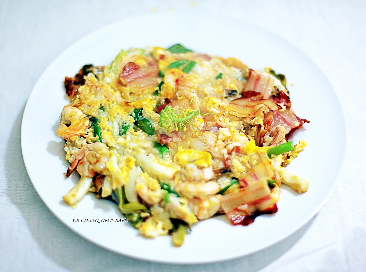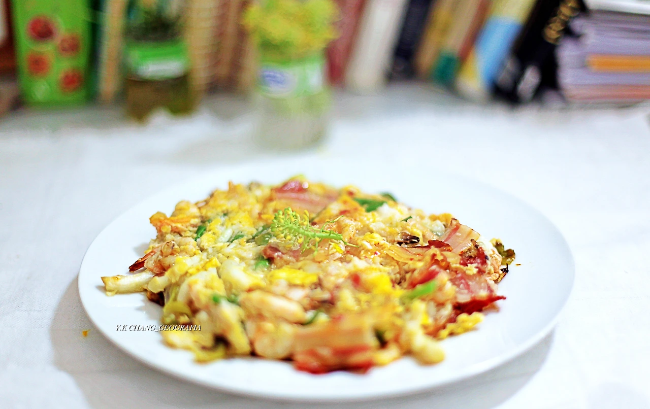 그리고 팬을 뜨겁게 달군 후 마늘 기름을 만들고 대파를 적당한 크기로 잘라 바닥에 깔았다. 그 위에 쌀 반죽을 골고루 흩뿌려 대파가 잘 달라붙도록 한 후, 준비한 새우와 빤체타를 골고루 흩뿌려 주걱으로 꼭꼭 눌러주었다. 그다음 중불로 식재료들이 적당히 잘 익었을 때 계란 두 개를 풀어 넣었다.