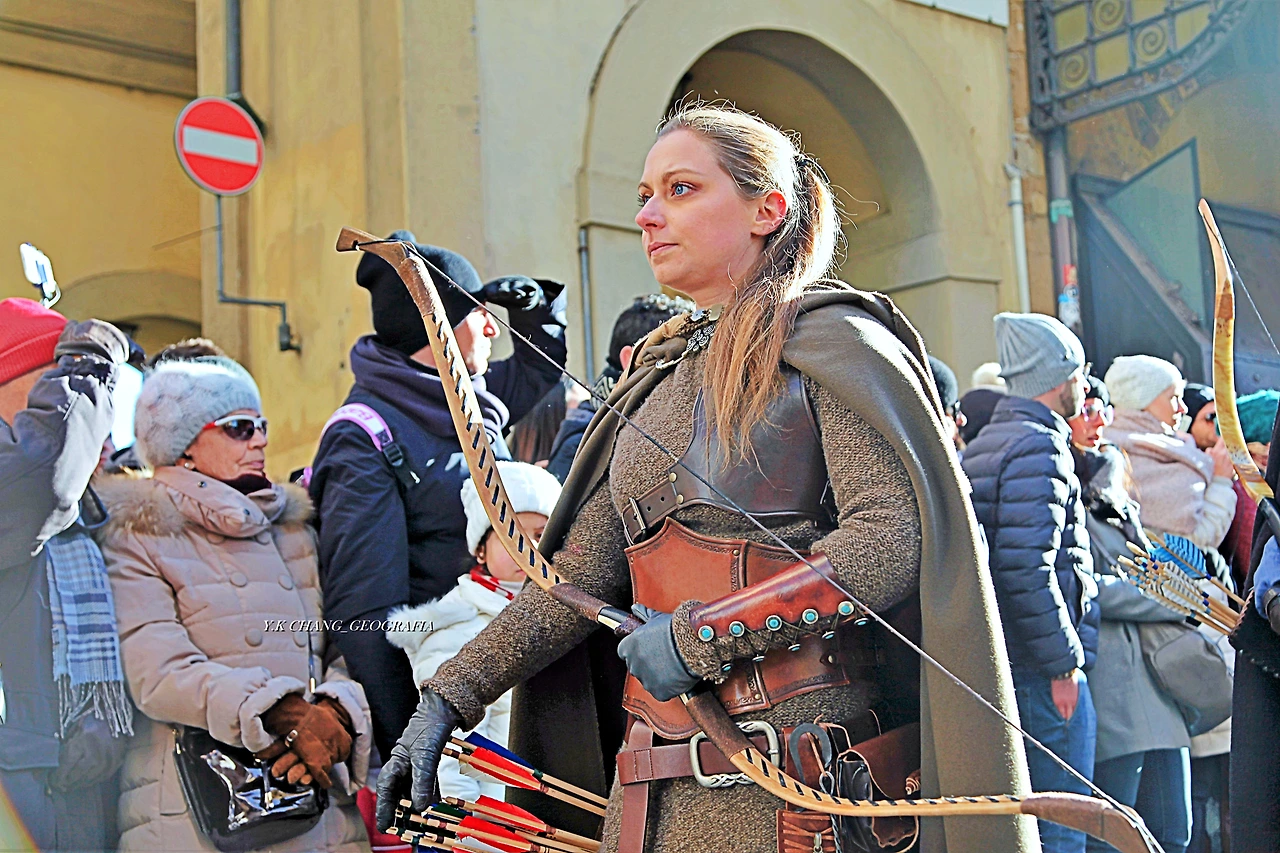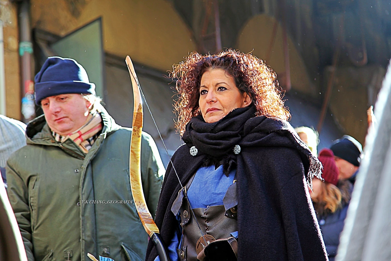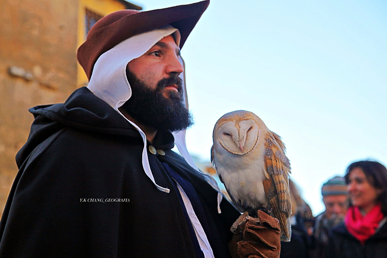 주지하다시피 종교적 압박이 매우 거셌던 중세 이후의 복식은 부의 정도에 따라 옷차림이 달라지는 것. 행렬 선두가 화려함의 극치를 이룬 반면에 뒤로 갈수록 소박한 차림이 눈에 도드라졌다. 그리고 이날 행렬에서 사람들의 눈길을 끈 것은 맹금류(매)를 이용한 사냥꾼들의 모습이었다. 잘 훈련된 매를 이용해 꿩 등 동물을 사냥하는 전통 방식의 차림을 뽄떼 베끼오 다리 위에서 만나는 한편, 사냥에 나서는 여성들의 차림이 마치 여전사를 방불케 했다.