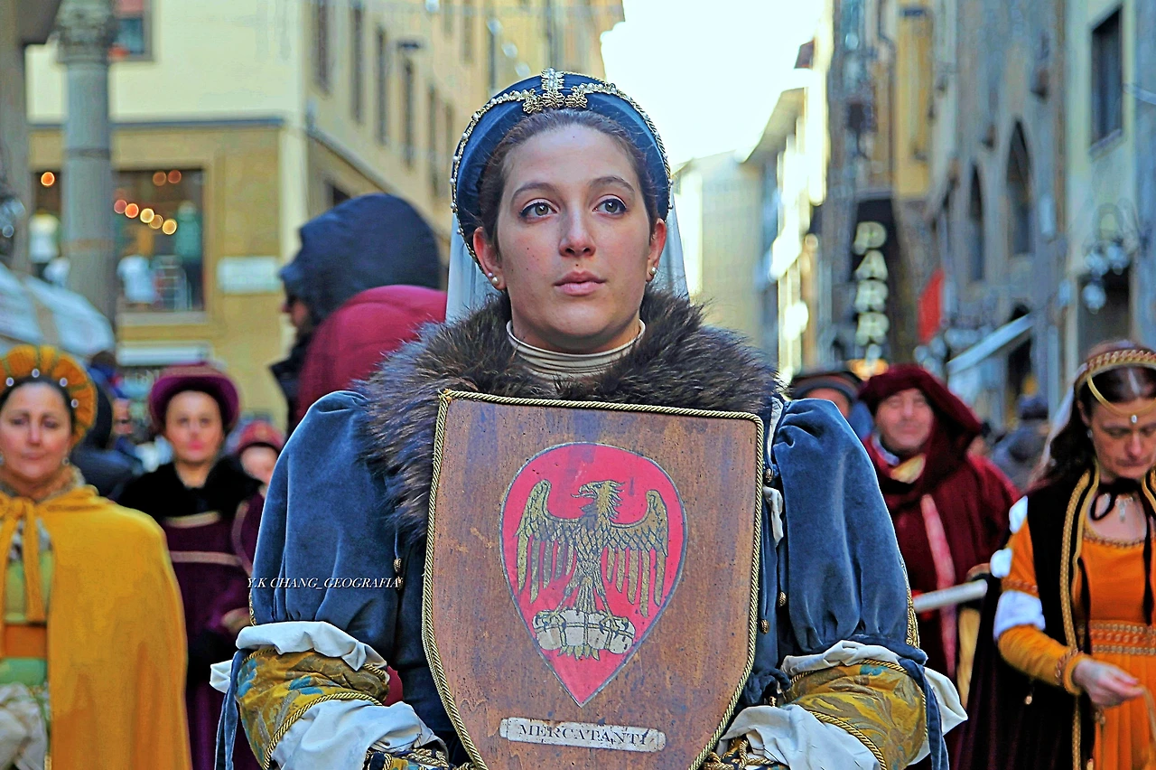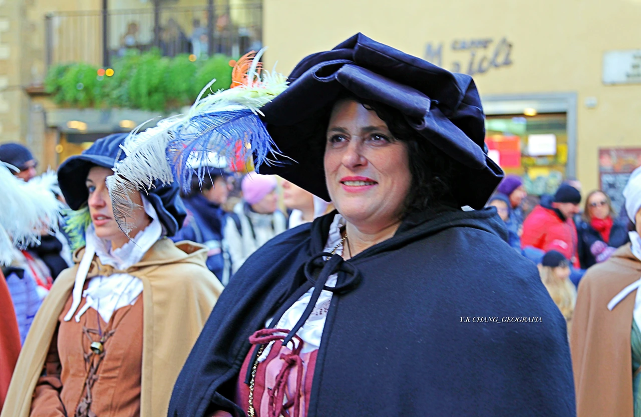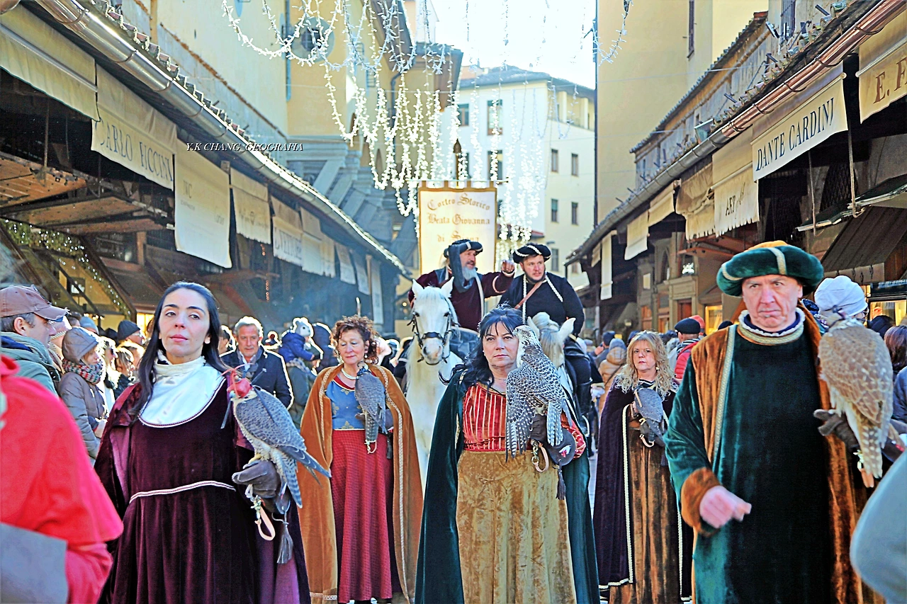 이날은 꽤 추웠다. 바람도 불었지만 음산한 날씨가 피렌체를 꽁꽁 얼게 만드는 가운데 이들 행렬은 빨라쪼 삐티 궁전(Palazzo Pitti)을 출발하여 삐아짜 데 삐티(Piazza de' Pitti)_일 뽄떼 베끼오(il Ponte vecchio)-뷔아 뽀르 산타 마리아(Via Por Santa Maria)를 거쳐 피렌체 시내 중심을 가로지르며 르네상스 시대의 향기를 풍기고 있었다.