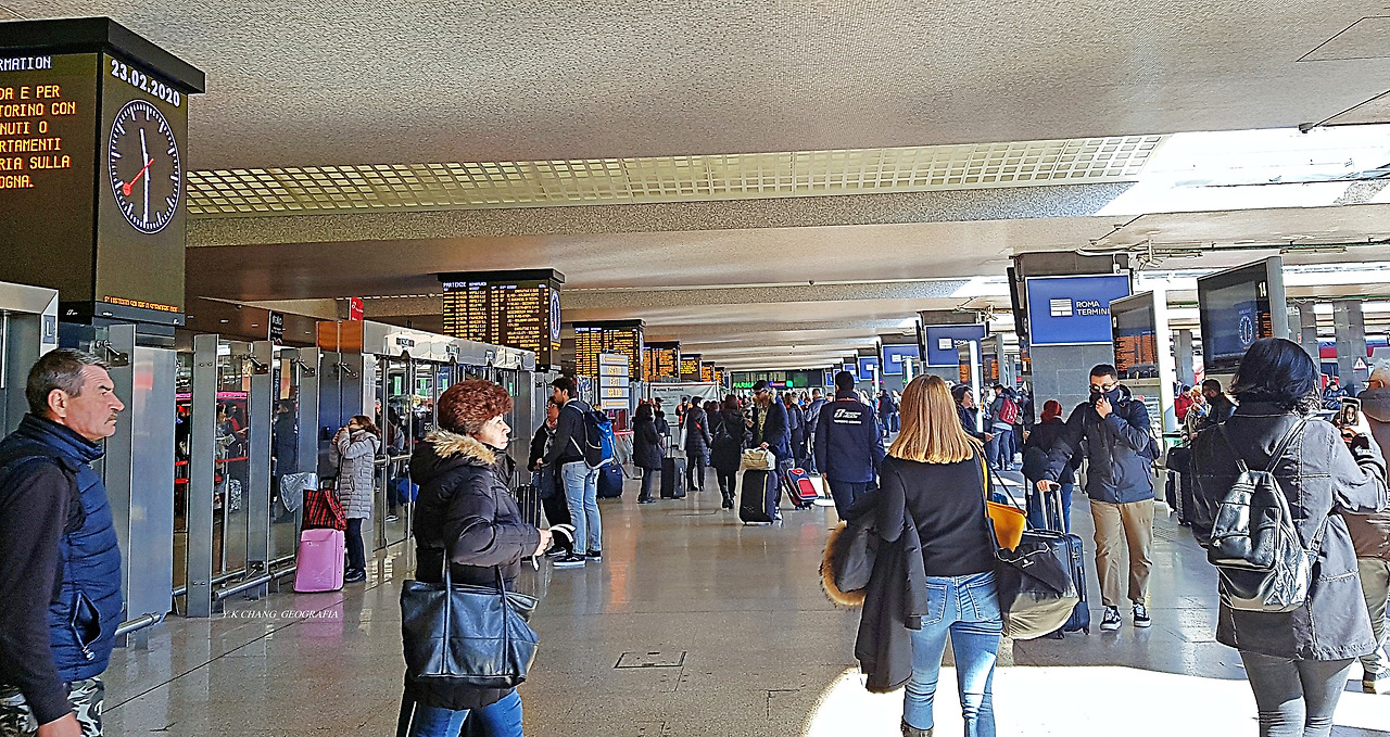 시간은 급행열차의 속도에 견줄 만큼 빨리도 흘러갔다. 그동안 창밖으로 따라다니던 풍경들이 느리게 느리게 지나치면서 마침내 내가 탄 기차는 로마의 떼르미니 역에 도착한 것이다. 졸다 깨다.. 창밖 풍경 대부분을 놓친 다음 떼르미니 역에 도착하니 대한민국을 통째로 들썩거리게 만든 꼬로나 비루스가 문득 떠올라 주변을 둘러봤다. 어쩌다 마스크를 쓴 사람들을 만날 수 있었지만 로마는 달랐다. 전 보다 눈에 띄게 줄어든 여행객 틈바구니 속에서 한 두 사람이 마스크에 의지하며 바쁘게 움직이고 있었다. 전광판의 시곗바늘은 오전 11시 30분..