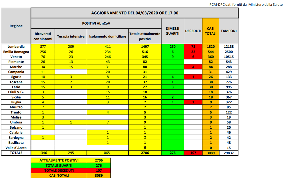 *Documentazione: Coronavirus in Italia: 3.089 casi, 107 morti e 276 guariti. Il bollettino regione per regione