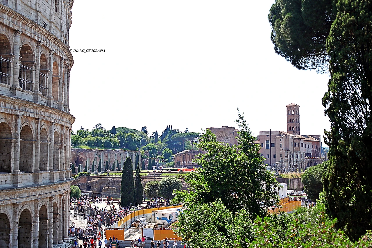 위 자료사진 뒤로 보이는 풍경은 빨라띠노 언덕이 위치한 곳으로 일곱 개의 언덕(Sette colli di Roma)중 한군 데이다. 그리고 좌측 꼴로세오 일부 너머로 에스퀼리노 언덕이 있는데 꼴로세오가 있는 현재 위치는 주거지역이었다. 그러나 서기 64년에 로마의 대화제가 발생하자 네로 황제(Nero_본명: 루키우스 도미티우스 아헤노바르부스(Lucius Domitius Ahenobarbus_황제가 된 후 개명: 네로 클라우디우스 카이사르 아우구스투스 게르마니쿠스(Nero Claudius Caesar Augustus Germanicus)는 거대한 황금 궁전 도무스 아우레아(Domus Aurea)와 인공 호수, 정원을 지었다.