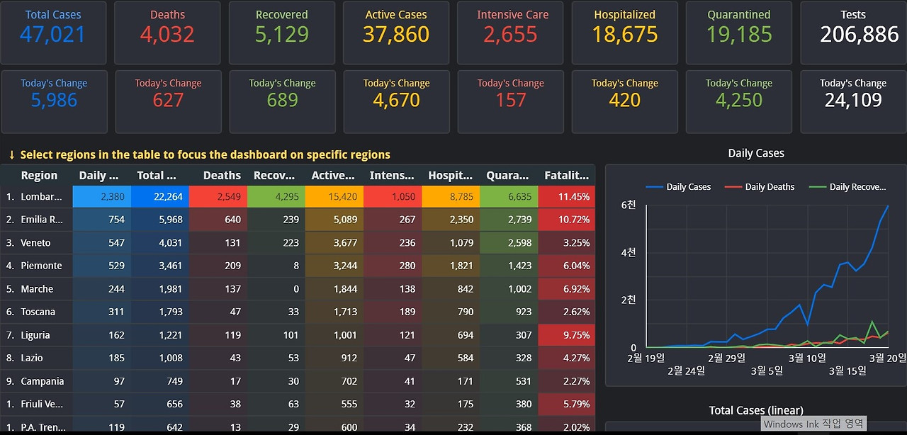 *위 도표는 이탈리아 전역의 꼬로나비루스 현황으로 링크를 클릭하면 자세한 내용을 확인할 수 있다.