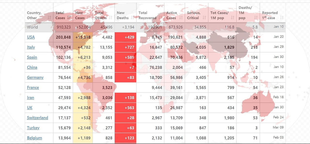 컴 앞에 앉기만 하면 눈에 띄는 게 비루스와의 전쟁 기록이다. 위 도표에서 잘 알 수 있듯이 불과 보름 전만 해도 미국은 물론 스페인과 프랑스 독일 영국 등은 중국과 한국을 미개인 취급하며 우월감에 들떠 있었다. 그런 나라들의 현재 상태는 그야말로 아수라장으로 변했다. 그중에서 미국과 스페인의 약진(?)은 놀랄만하다.