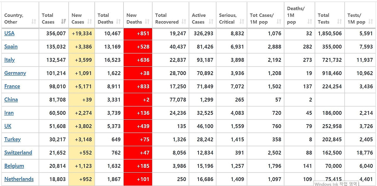 확진자 수는 전날에 비해 현저히 감소했으나 사망자 수는 거의 100명 더 늘었다. 또 치료자 수도 줄어들어 실낱같은 희망이 잠시 멀어진 날이다. 그럼에도 불구하고 최근 확진자 수가 크게 줄어들어 다시 희망의 날을 잇게 됐다. 반면 위 통계 자료를 참조하면 미국 스페인 독일 프랑스 등의 약진세가 도드라진다. 지구별의 위기는 계속되고 있다.