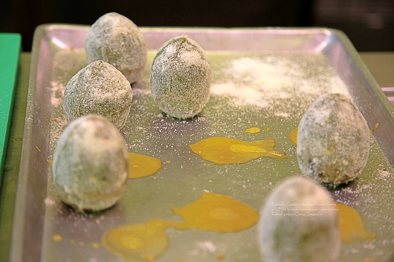 마지막으로 계란 노른자를 입히니 카르치오피가 마치 금덩어리로 변한 듯, 꽃단장을 마치고 외출 채비에 나선 누이처럼 친근하다. 아마 여기까지 보신 분들은 다음 공정이 눈에 선할 듯하다. 튀김옷을 입고 튀겨지기 직전의 풍경..?!
