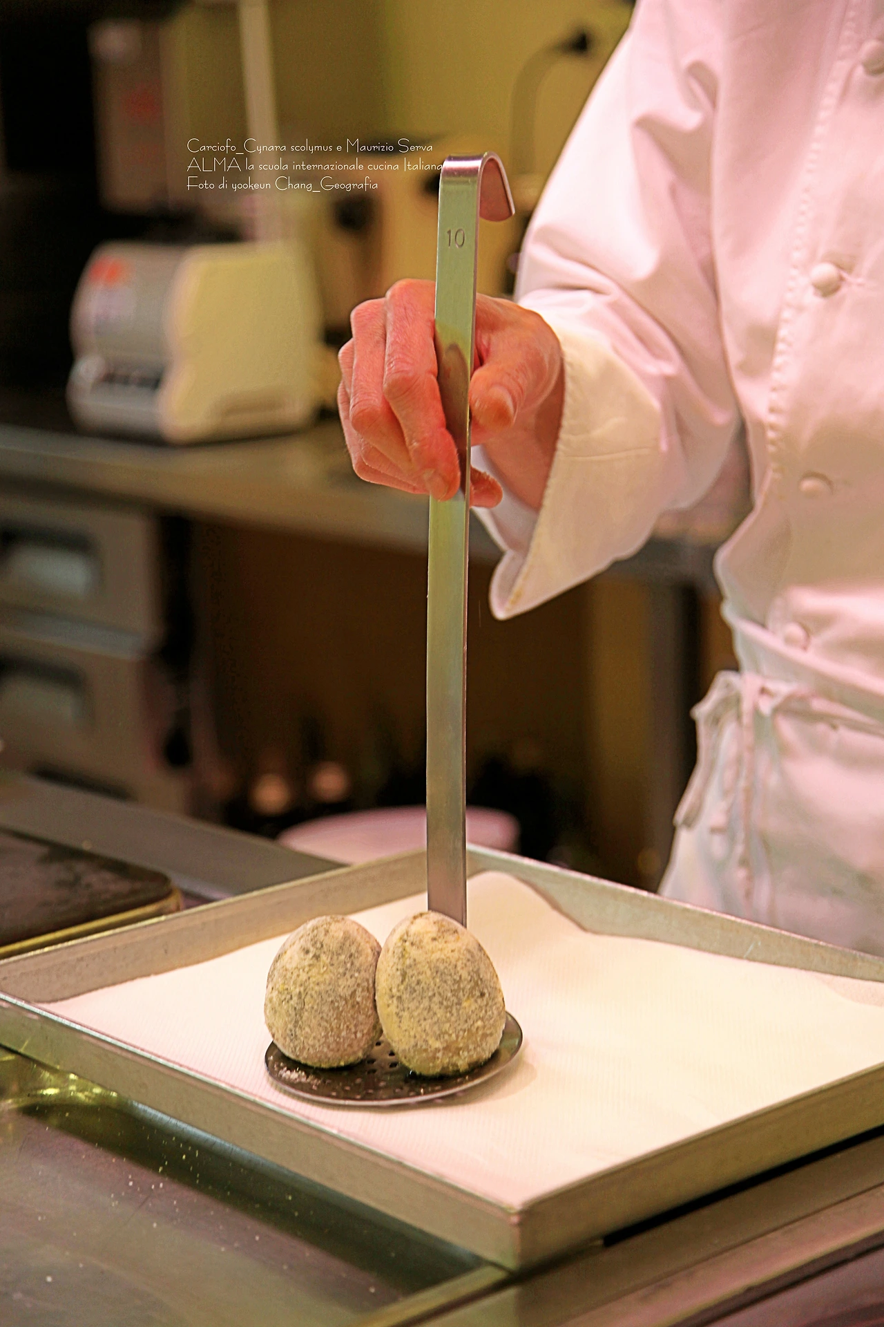 마침내 카르치오피 두 개가 후끈 달아오른 해바라기유(olio di gira sole) 가득한 냄비 속으로 들어갈 채비를 갖추었다. 그리고 마지막 꽃단장을 하고 있는 셰프 앞으로 곧 모습을 드러내게 될 것.