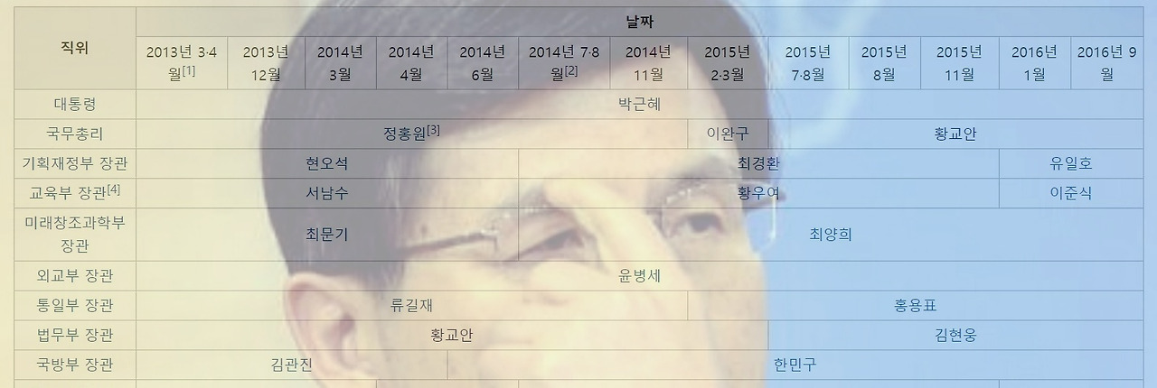 아래 자료 사진에 박근혜 정부 당시 황교안이 법무장관과 국무총리를 맡았던 시기가 잘 정리되어있다. 또 세월호 참사 당시 국방부 장관을 지낸 김관진을 눈여겨봐 두시기 바란다. 황교안은 세월호 참사의 교사자 역할을 했을까..