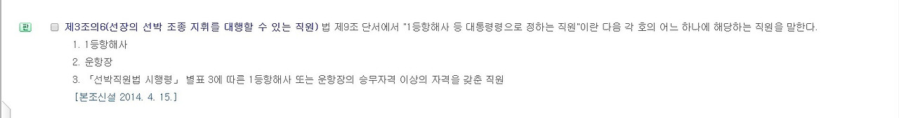 위 자료는 관련 법률을 캡처한 내용이며 자료 아래 [본조 신설 2014. 4.15]이라고 표시되어 있다. 세월호 참사 하루 전에 일어난 일이다. 그리고 제3조의 6(선장의 선박 조정 지휘를 대행할 수 있는 직원) 법 제9조의 단서에서 1등 항해사의 역할을 명시해 놓고 있다. 일등항해사는 갑판 부서의 장으로서 항해사 및 갑판 부원들을 통솔하고 지휘하는 역할을 한다. 그런 한편 선장의 유고 혹은 부재 시 선장의 역할을 수행하는 대선장(부선장)의 지위를 가지고 있다고 말하는데 굳이 이 법을 따로 만든 이유는 무엇일까..