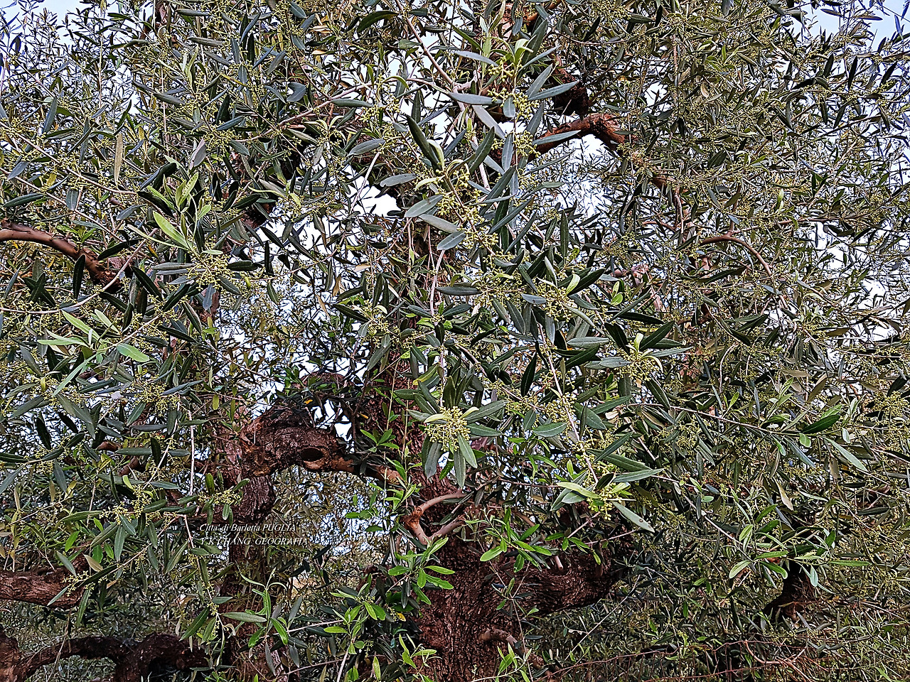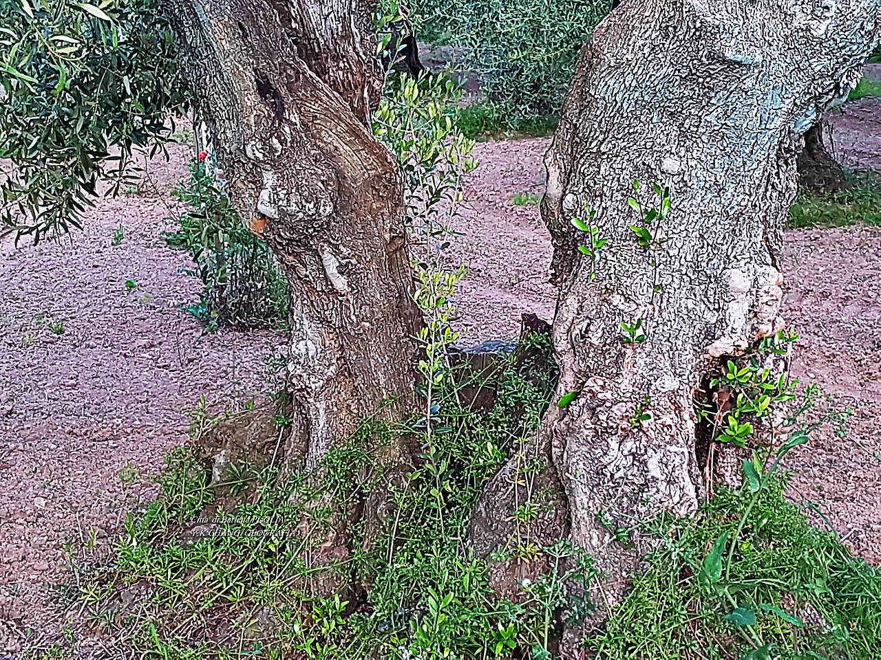 (여기까지 스크롤바를 내리며 읽으신 분들께서 올리브나무에 대한 선호도는 어떠신지 잘 모르겠다.) 5월 초하루에 만난 올리브 나무는 꽃잎을 다 떨구고 눈에 보일 듯 말듯한 열매를 빼곡히 가지에 매달고 있었다. 그리고 연초록 이파리와 짙은 초록색깔이 기막히게 어우러진 나무 아래로 수령 수백 년 이상은 거뜬히 넘긴, 울퉁불퉁 근육질(?)의 줄기와 나뭇가지가 목신처럼 우리는 맞이하고 있는 것이다.
