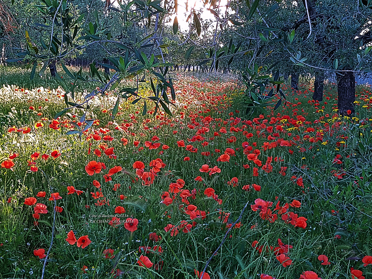 서기 2020년 5월 5일 해 질 녘, 아내와 함께 바를레타 근교의 올리브 과수원을 찾아 나서다. 바람은 살랑살랑 황금빛 햇살 마구 쏟아지다.. 4월이 저만치 비켜선 자리 풀꽃들의 대합창. 꿈같은 풍경 속을 둘이 거닐었네 피곤한 줄도 모르고.. 집으로 돌아오는 길에 만난 몇 사람에게 "너희들은 좋겠다. 천국에 살고 있으니.."라고 말했다. 그랬더니 한 녀석이 손으로 하늘을 가리키며 "천국은 저곳에.."라고 말했다. 씩 웃고 말았다. 천상의 풍경이 이 보다 더 좋겠나.. 아내는 너무 걸어서 다리가 아프단다. 천국에 가시면 원래 그런 겁니다..!