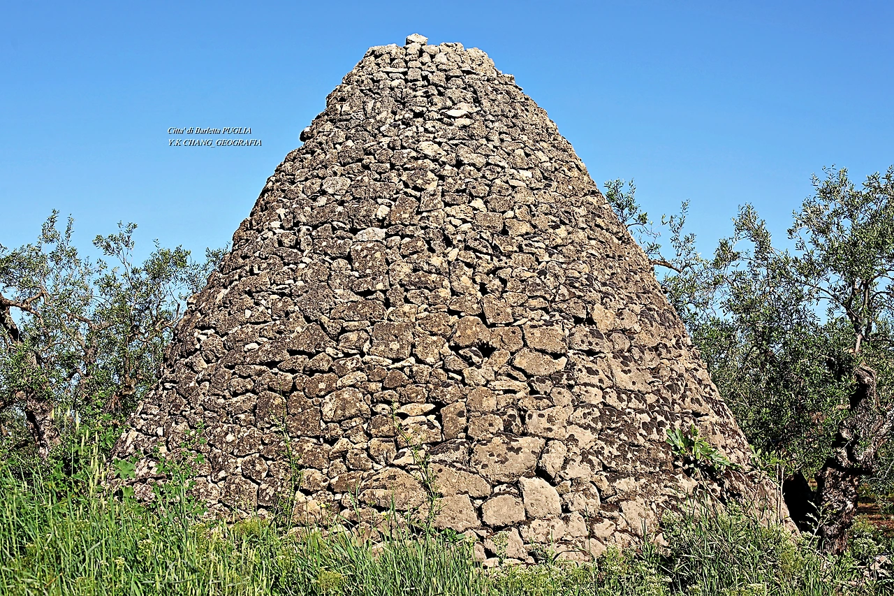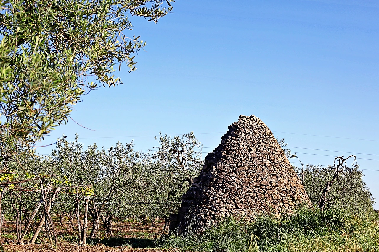 A oriente della foce del fiume Ofanto, in gran parte dell’agro del comune di Barletta (e sporadicamente in quello di Trani), prevalgono costruzioni a secco dalla forma primaria ogivale che non prevedono la netta distinzione del basamento dalla copertura in aggetto. La superficie esterna, caratterizzata dall’opera muraria a secco, si incurva gradatamente e giunge fino all’apice fungendo così da tegumento; in genere, vista l’irregolarità dei conci e la porosità degli stessi, per garantirne una certa impermeabilità, la copertura muraria esterna (oltre che interna) viene ricoperta da un impasto magro di terra e sabbia.