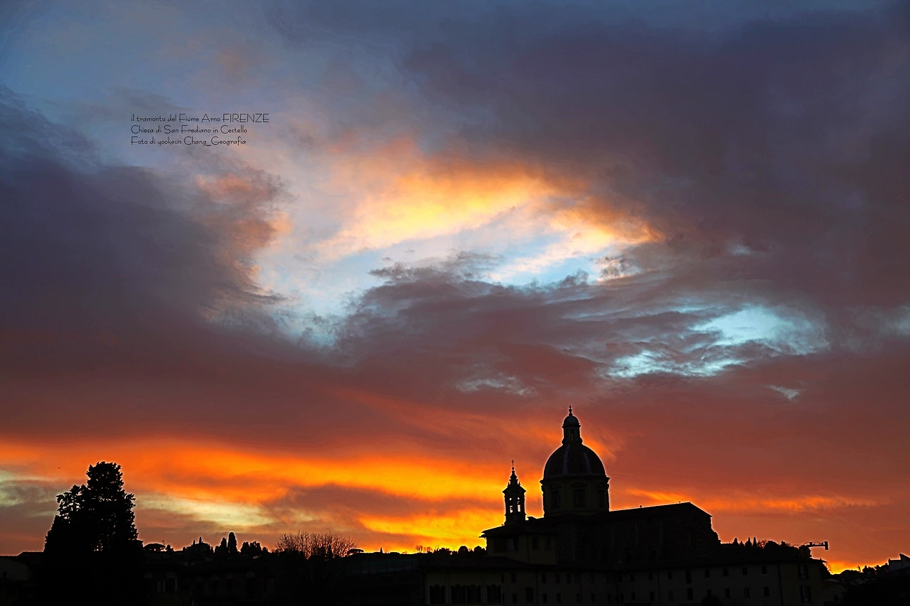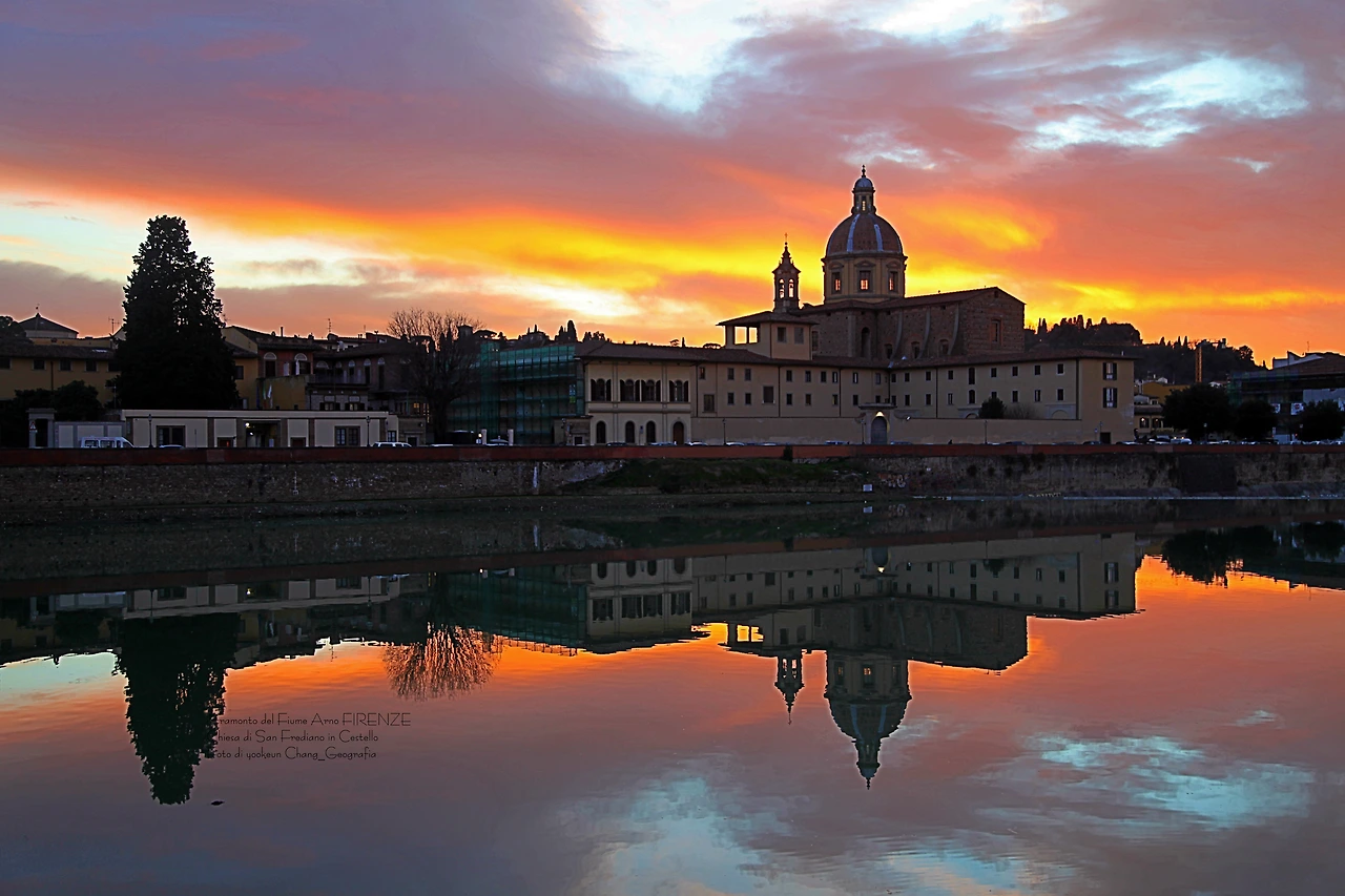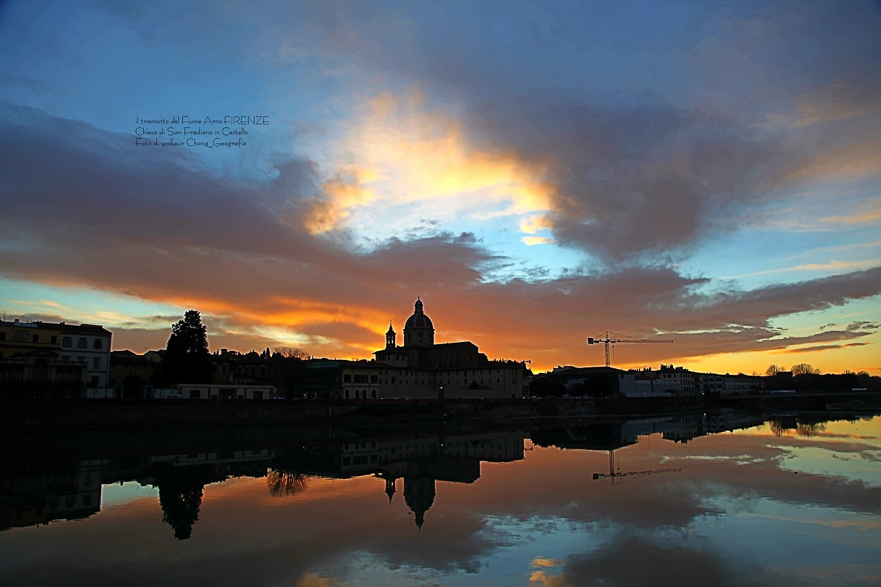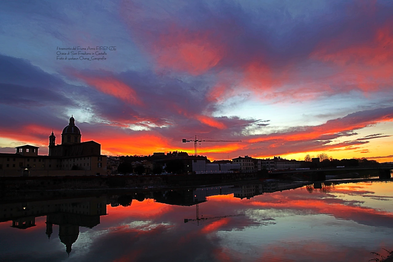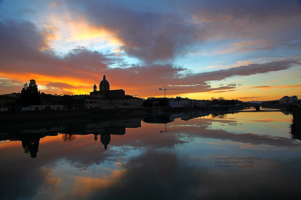 영상과 사진은 서로 다른 날 촬영된 아르노 강의 일몰 풍경이다. 피렌체의 숨겨진 일몰 명소는 피렌체의 상징인 일 뽄떼 베끼오(il Ponte Vecchio)로부터 서쪽으로 세 번째 위치한 일 뽄떼 알라 까라이아(il Ponte Alla Carraia)에서 끼에사 디 산 프레디아노 인 체스뗄로(Chiesa di San Frediano in Cestello) 쪽으로 바라보이는 곳. 구름이 없는 맑은 날씨보다 구름 낀 날씨가 보다 더 스펙터클 하다는 거..