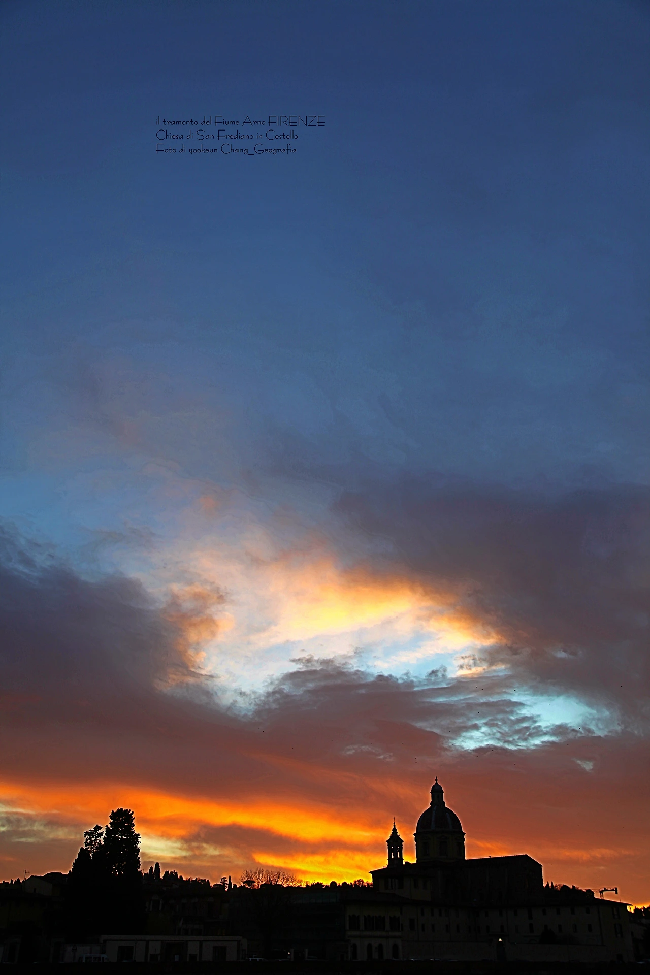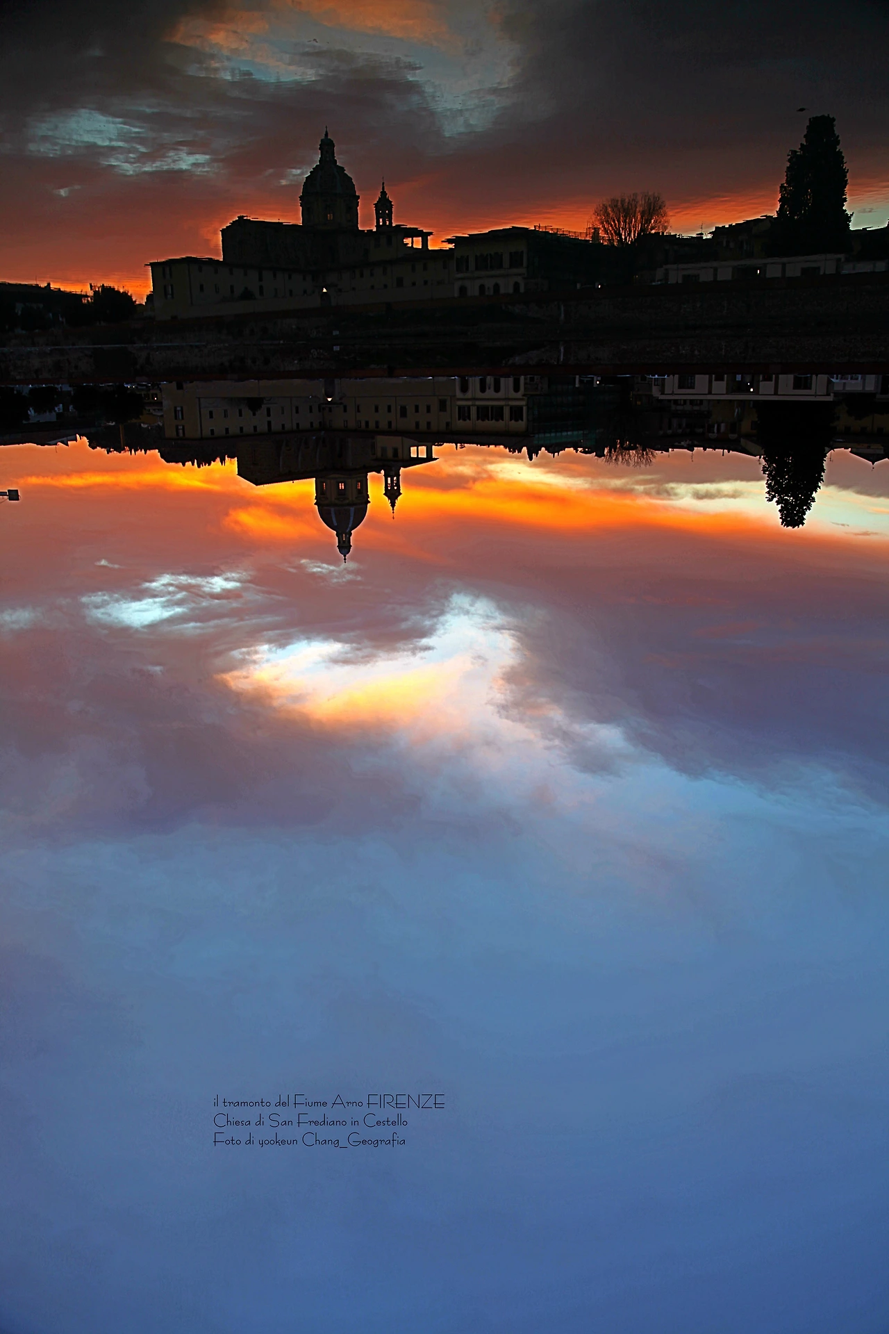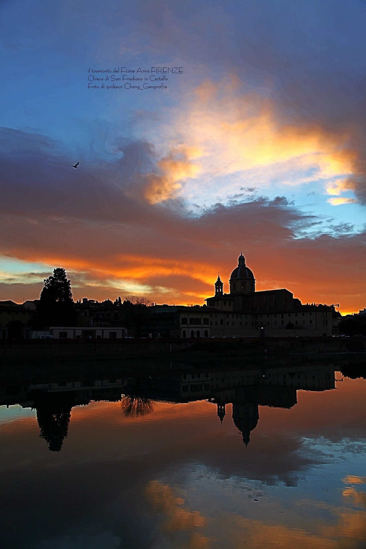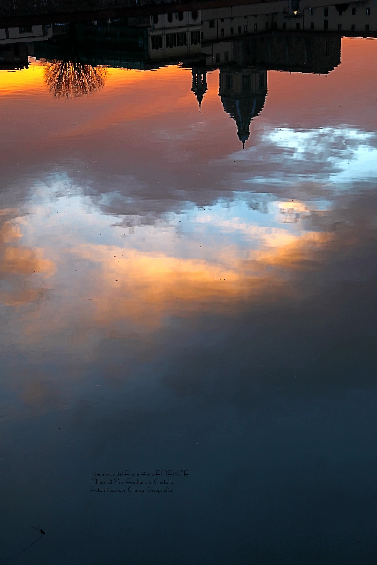 영상과 사진은 서로 다른 날 촬영된 아르노 강의 일몰 풍경이다. 피렌체의 숨겨진 일몰 명소는 피렌체의 상징인 일 뽄떼 베끼오(il Ponte Vecchio)로부터 서쪽으로 세 번째 위치한 일 뽄떼 알라 까라이아(il Ponte Alla Carraia)에서 끼에사 디 산 프레디아노 인 체스뗄로(Chiesa di San Frediano in Cestello) 쪽으로 바라보이는 곳. 구름이 없는 맑은 날씨보다 구름 낀 날씨가 보다 더 스펙터클 하다는 거..