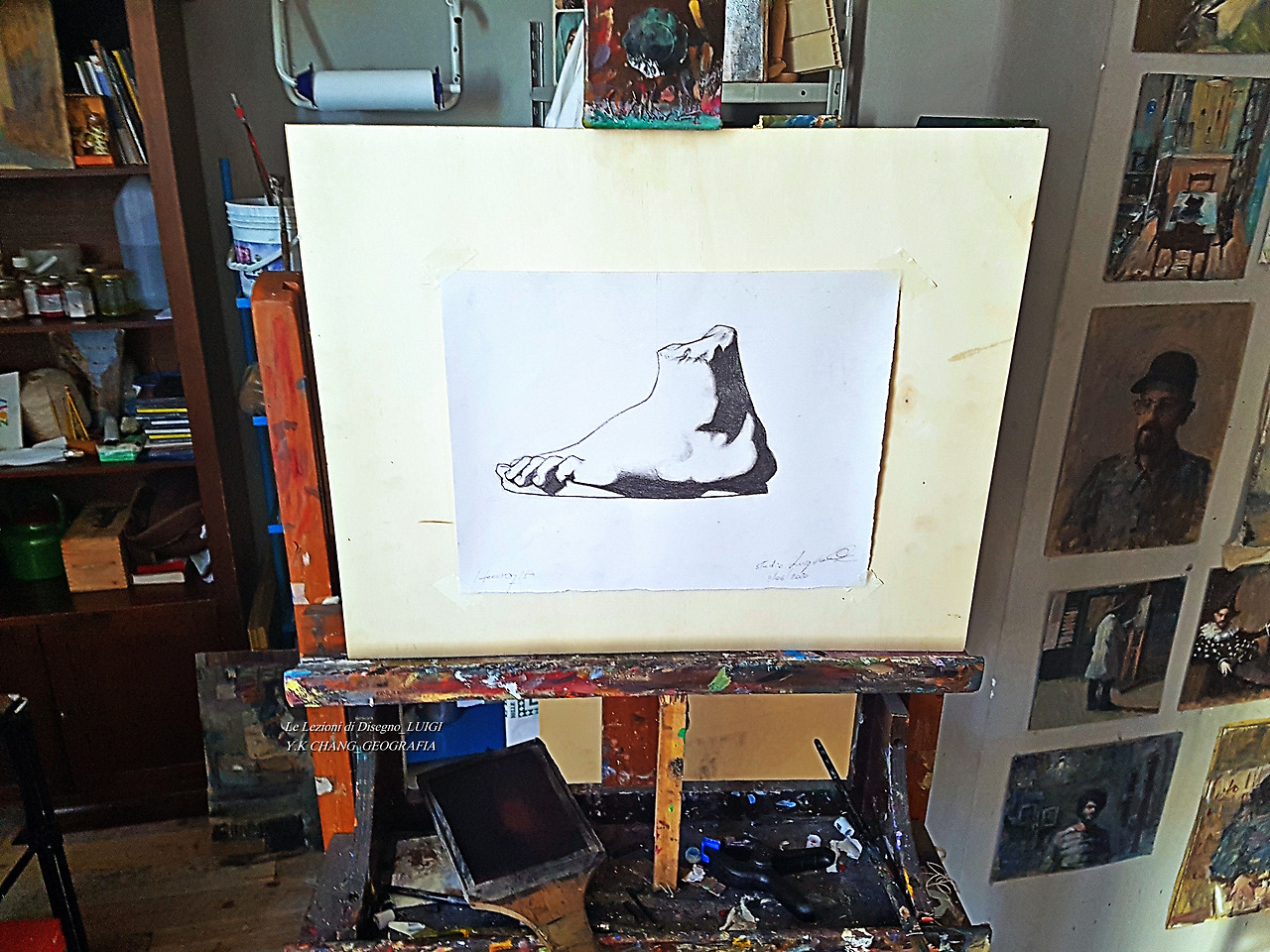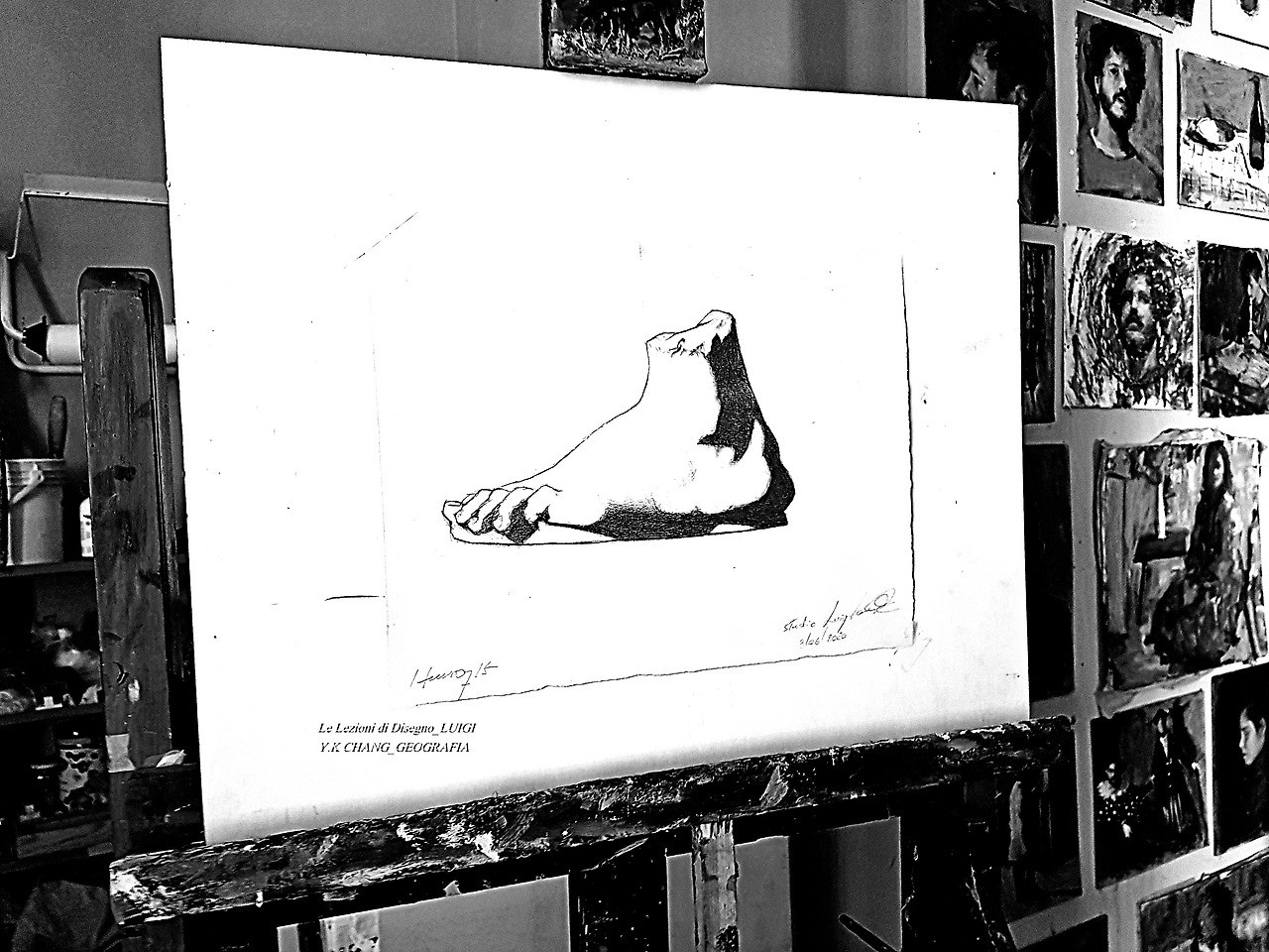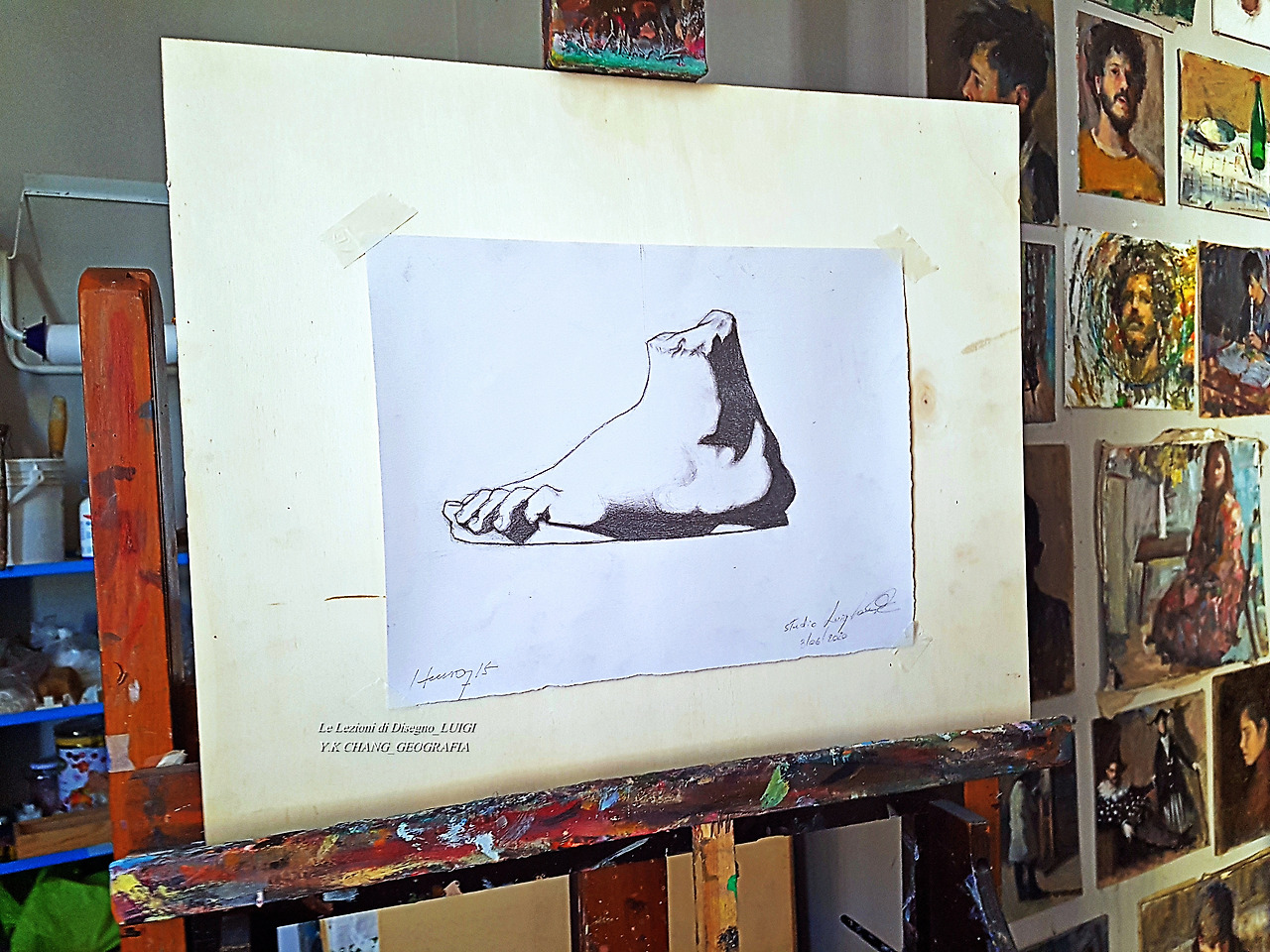 서기 2020년 6월 3일 오전 10시 30분경, 아내에게 그림 수업을 지도한 아티스트 루이지 라노떼(이하 '루이지'라 부른다)와 우리는 하이 파이브를 하며 아이들처럼 기뻐했다. 그림 수업을 시작한 이래 처음으로 소묘 한 점이 완성된 것이다. 결과물을 놓고 보면 별것 아닌 것처럼 여겨질지 모르겠지만 과정은 치열했다. 일주일에 두 번, 한차례에 3시간의 수업이 진행되는 동안 한 눈 팔 시간적 여유 조차 없었다. 빠르게 진행되는 동시통역을 따라 아내의 오감은 백지장 위에 집중되어야 했다. 첫 수업의 풍경은 이렇게 썼다.