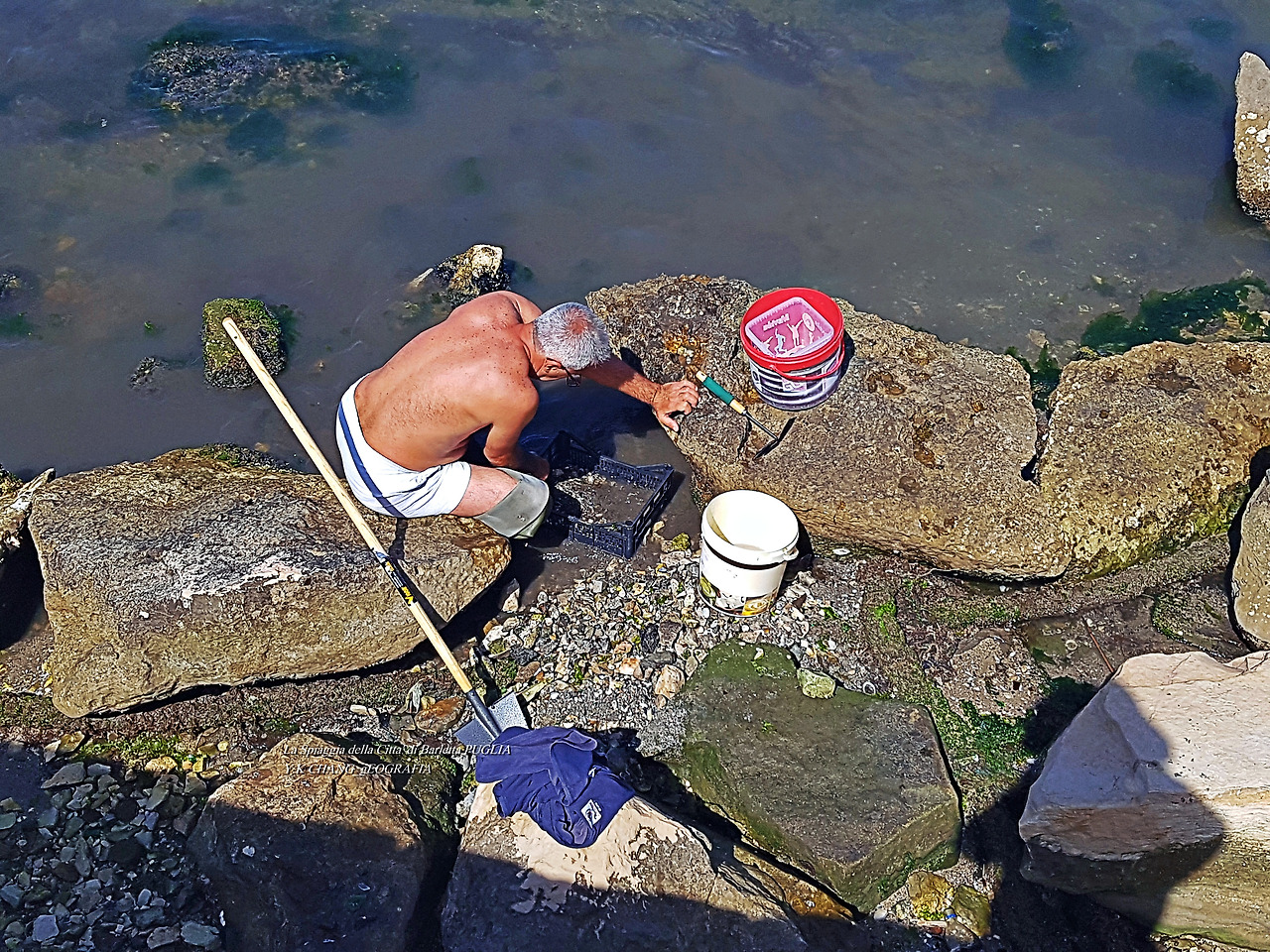 한 시민이 방파제 옆 갯벌을 뒤지며 봉골레(Vongole) 채집에 열중하고 있다. 아드리아해는 봉골래뿐만 아니라 다양한 해산물의 보고이다.