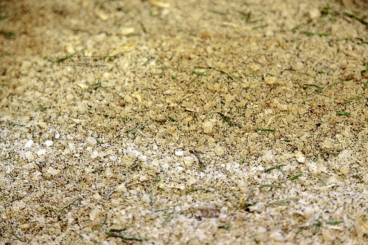 위 자료 사진을 살펴보면 굵은소금(Sale grosso) 사이로 파릇한 빛깔과 거뭇한 점들이 무수히 박힌 것을 볼 수 있다. 마지막 숙성 단계에서 로즈마리노(Il rosmarino)와 소금 후추 등 향신초를 가미한 모습이다. 이런 과정은 돼지비계를 잘 손질하는 과정을 거친 후 두 번의 숙성 과정을 거쳐 변신을 거듭하게 된다. 그 모습은 아래와 같다.
