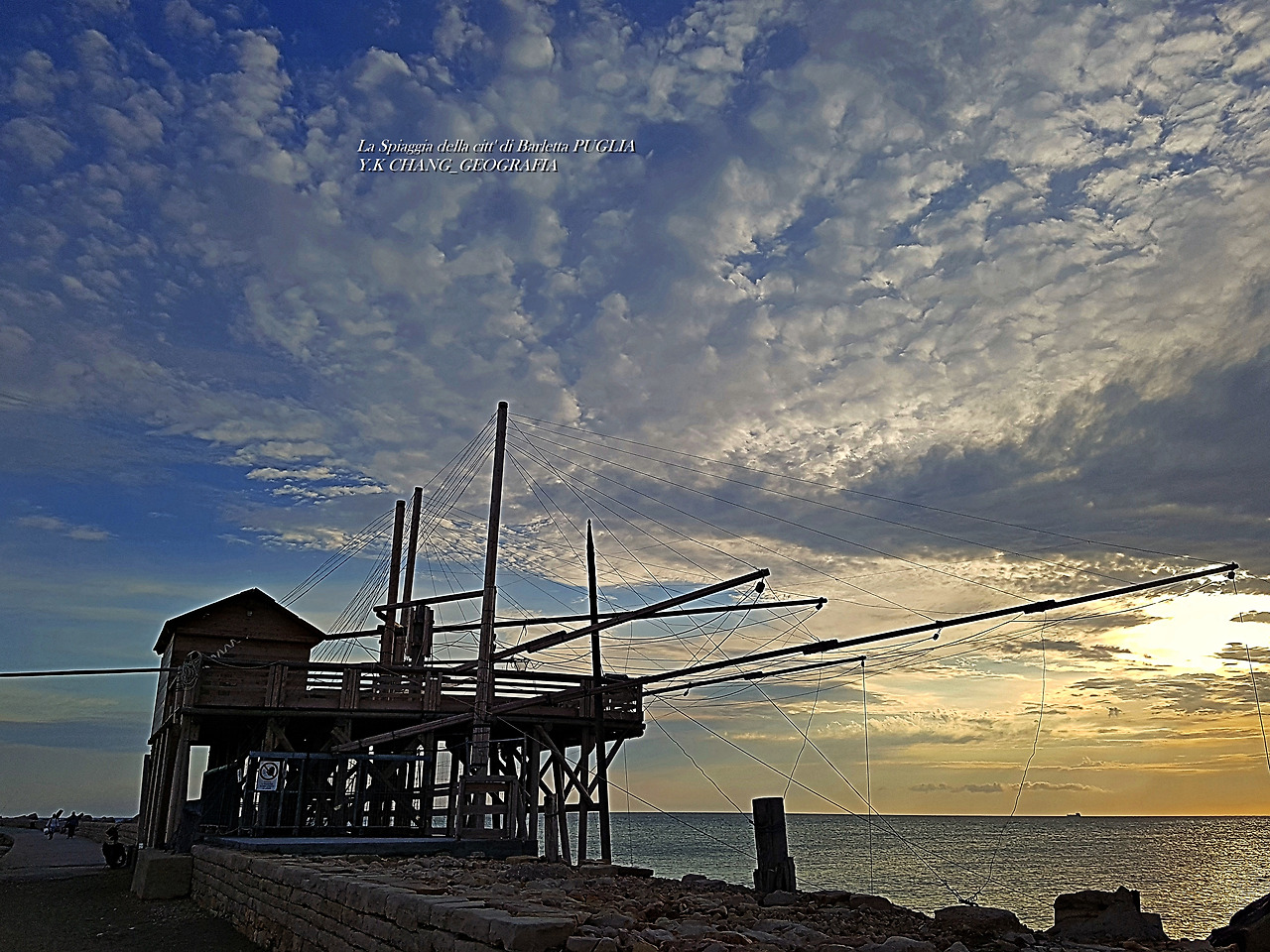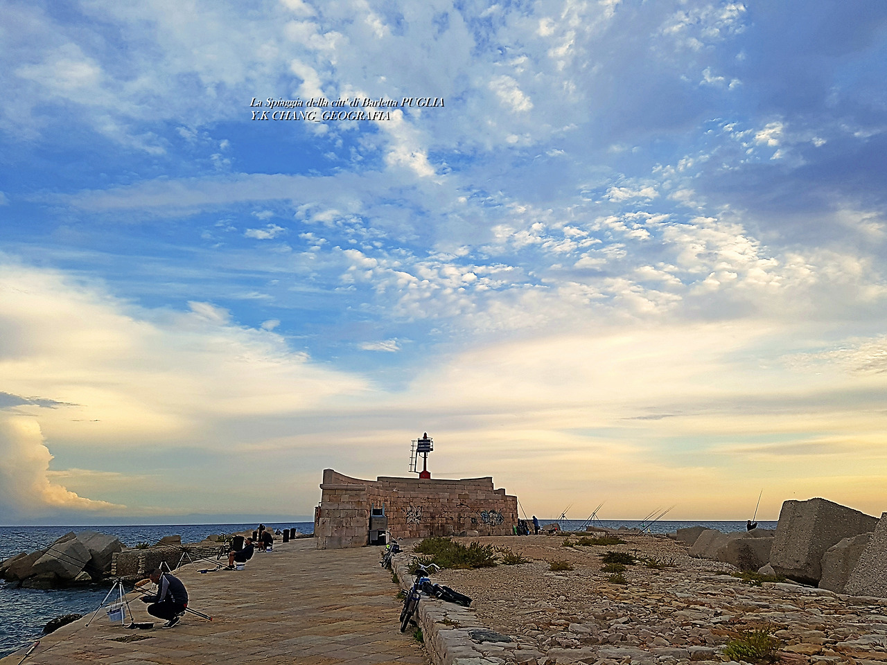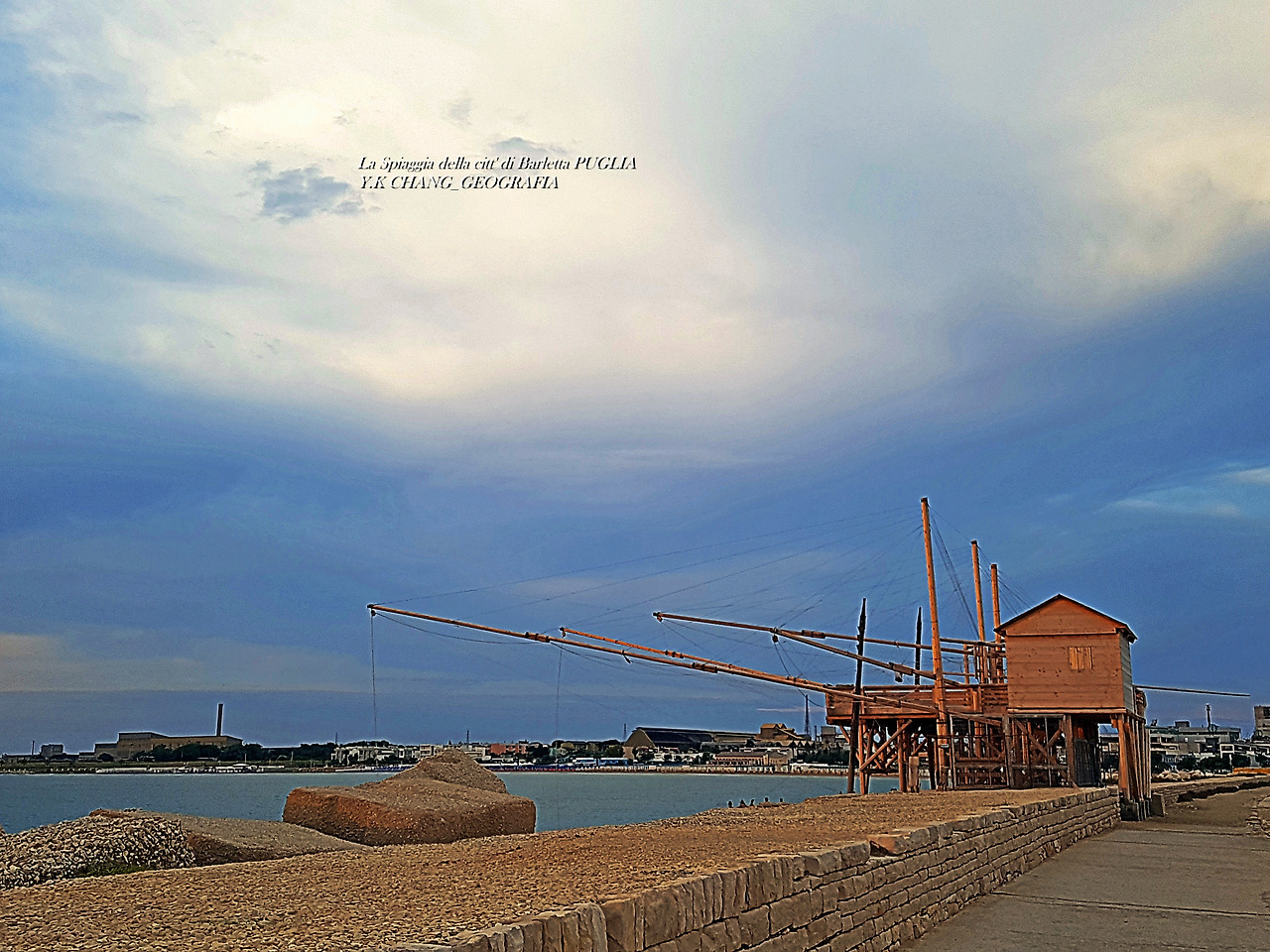 수평선 오른쪽으로는 바를레타 내항을 보호하고 있는 방파제로 시설물이 하나 보인다. 시설물 이름은 재래식 고기잡이 도구로 일 뜨라부꼬(Il Trabucco)라 부른다. 바를레타의 명물(Il Trabucco di Barletta)로 모두 허물어진 것을 최근에 다시 완성을 했다. 설명을 따로 하기로 한다.