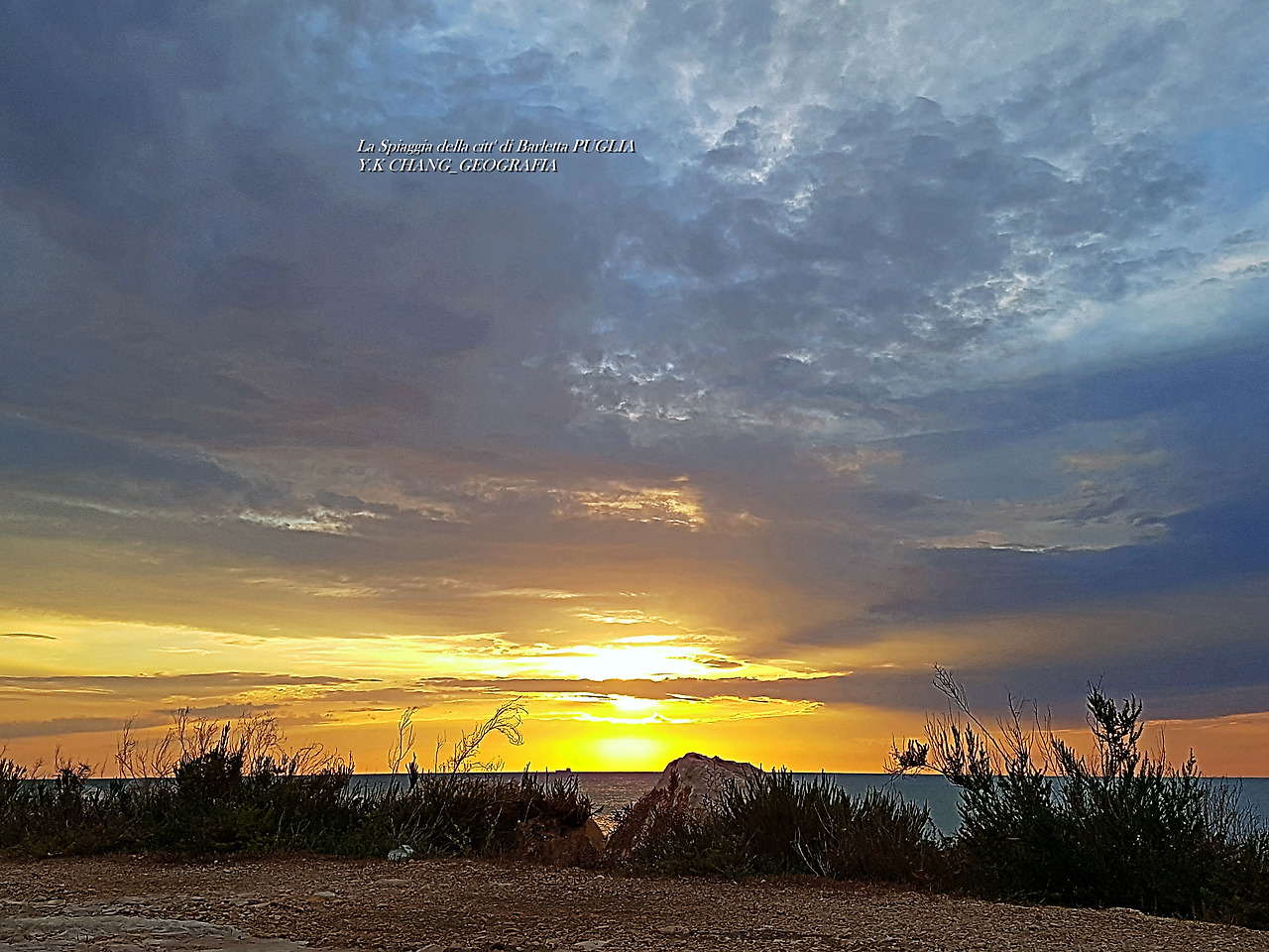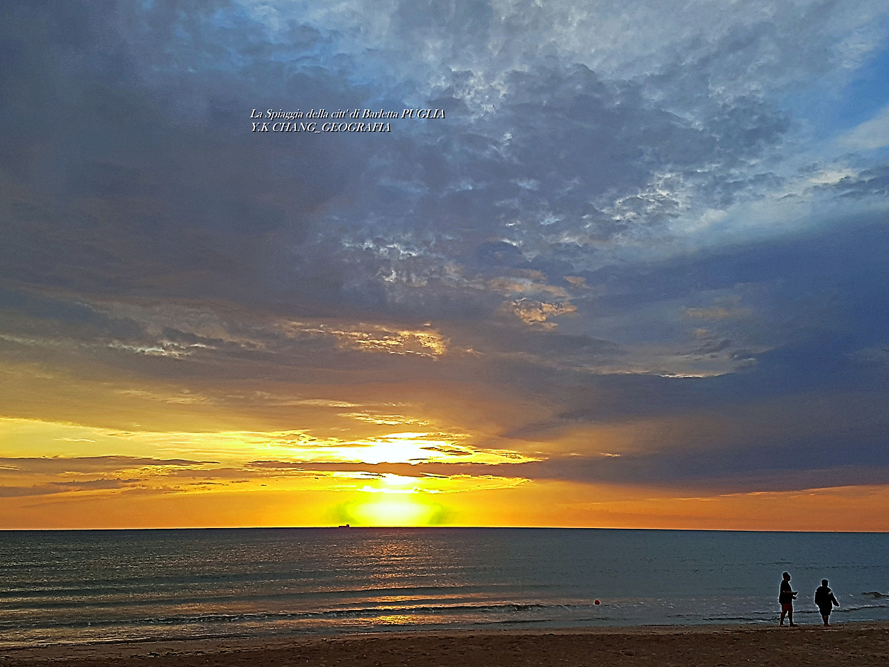 먼동이 터오는 바닷가의 풍경.. 이곳은 우리가 살고 있는 이탈리아 남부 뿔리아 주 바를레타의 항구 모습이다. 바다는 아드리아해.. 집에서부터 이곳까지 5분 남짓이면 도착하는 장소이다. 저 멀리 수평선 가운데쯤 좌측으로 등대가 보이고 종려나무 실루엣 오른쪽으로 까만 점은 등주이다. 좌우로 하나씩 설치된 가운데로 선박들이 입출항을 하는 것이다.