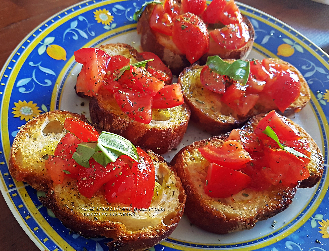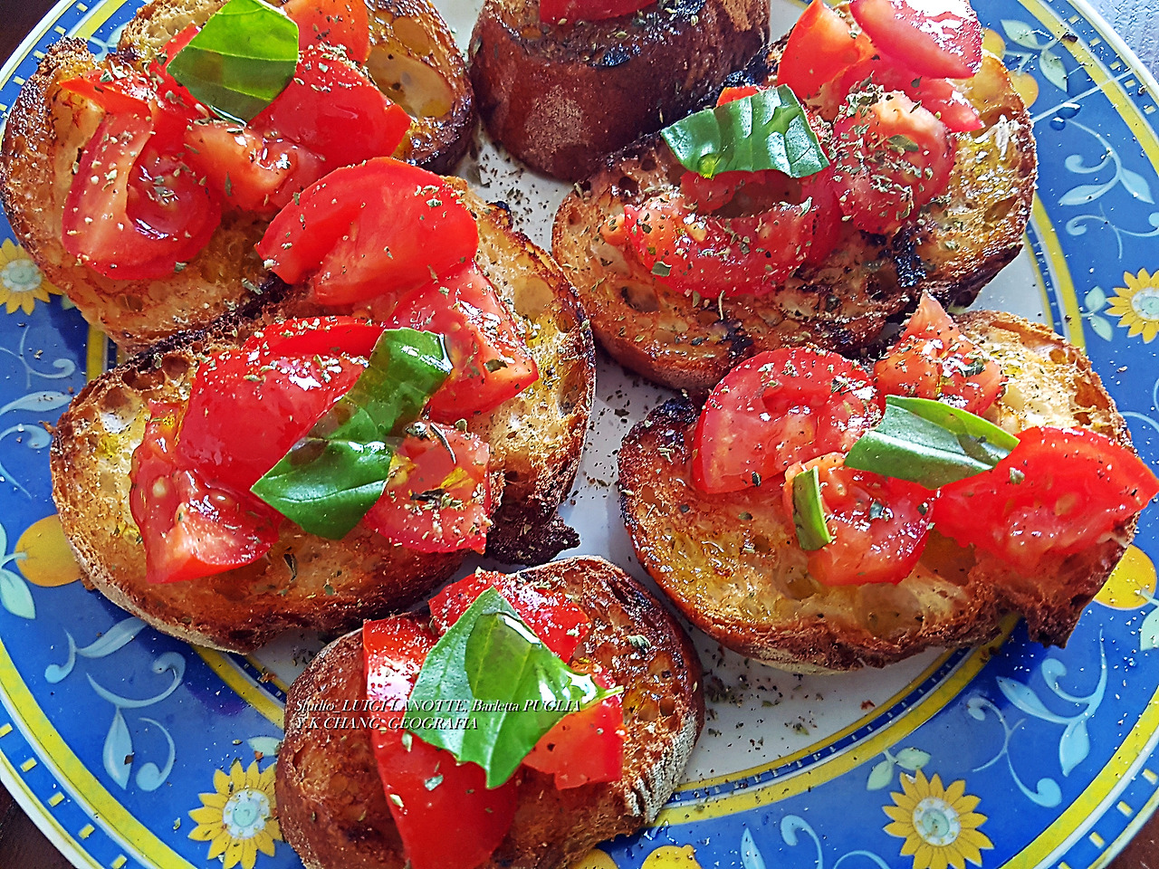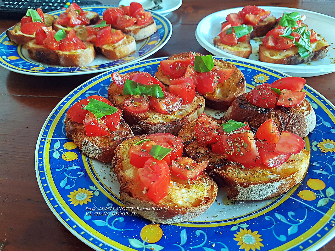 서기 2020년 7월 24일 오전, 하니의 그림 수업 도중 그림 선생님 루이지 라노떼(Luigi Lanotte)는 주방에서 방울토마토를 손질하고 있었다. 그의 곁에는 팬 위에서 빵이 구워지고(Grigliata) 있었다. 빵은 적당히 얇게 썰어졌는데 빵 굽는 냄새가 주방 안을 가득 메웠다. 그 모습을 지켜보다가 "부루스께따군..!"이라고 했더니 쓰윽 돌아보면서 고개를 끄덕였다. 루이지가 아침을 먹나 보다 생각했는데 그의 대답이 의외였다. 그는 "하니와 우리가 먹을 간식(Merenda)"이라고 했다. 그래서 리체타를 알고 있는 나는 테라스에 있는 바실리코 화분에서 이파리 몇 닢을 뜯어와 루이지 옆에 두었다.