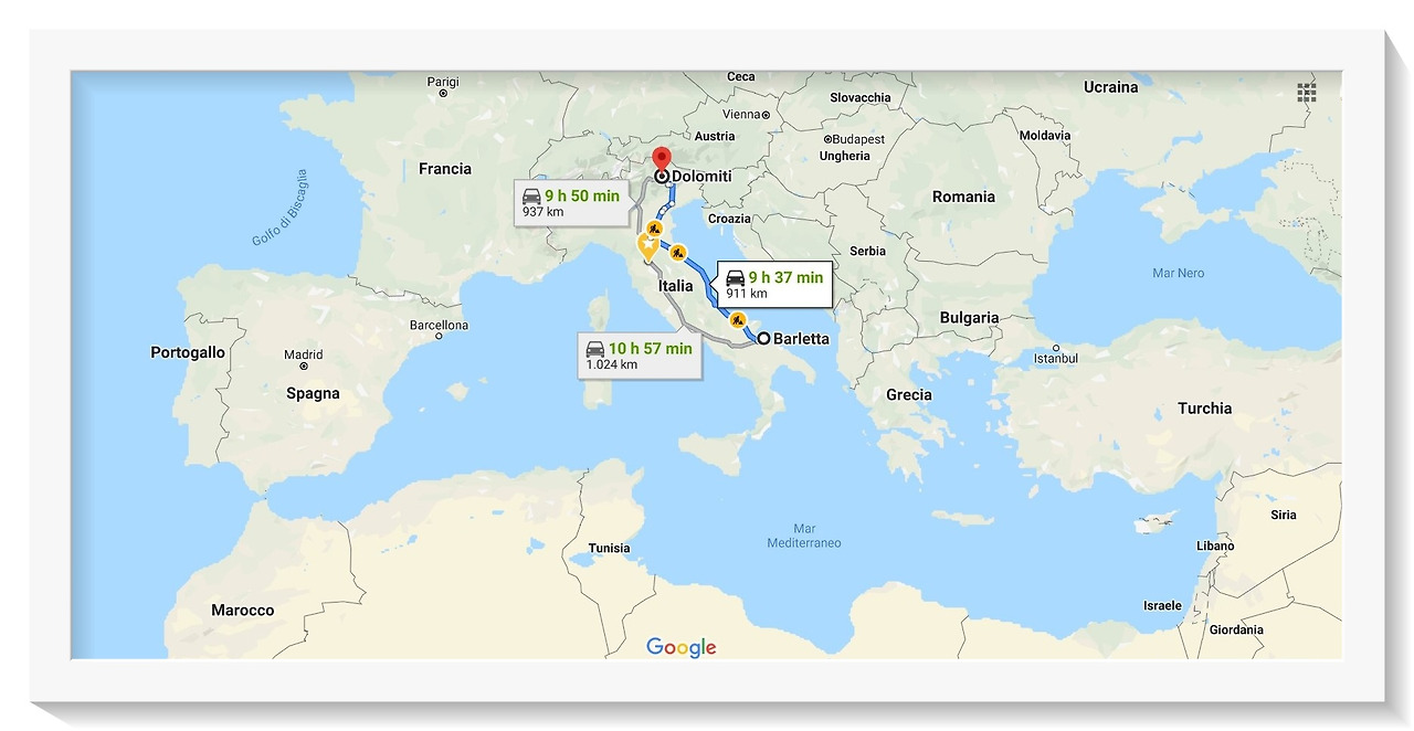 글 제목에 환상이라고 적어둔 이유는 다름 아니었다. 우리가 계획을 하고 있어도 일은 늘 마음대로 뜻대로 되지 않았다. 그래서 꿈을 꾸기 시작하면 그 꿈이 현실로 이루어질 때까지 환상처럼 가슴에 남아도는 것이다. (지도: 바를레타에서 돌로미티 가는 길)