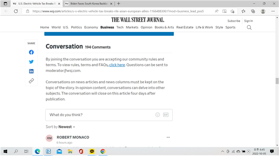바이든의 민주당 정부가 동맹국들의 비판과 WTO 규정 위반을 염두에 두지 않고 이 법안을 만들었을까? 아마도 11월 중간 선거가 끝날 때까지 이 법안을 유지할 가능성이 크다. 이후에 법안 수정 작업에 들어갈 것으로 보인다. 왜냐하면 이 법안은 WTO 규정 위반 내용을 포함하기 때문에 이 소송을 당하면 패할 것이 분명하기 때문이다. 월스트리트저널(WSJ)의 기사 아래의 댓글을 읽어보니 여러 가지 미국인들의 목소리가 담겨 있었다.