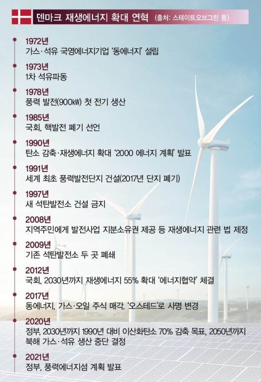 항구도시 에스비에르가 처음부터 녹색 도시였던 것은 아니다. 과거의 석유 개발 사업이 활발했던 에스비에르는 1972년 덴마크 정부가 51%의 지분을 소유하는 오스테드(Osted)가 설립돼 가스·석유 시추에 적극 나섰다. ‘1차 석유 파동’을 겪으며 에너지 안보에 눈을 뜬 뒤에도, ‘녹색 전환’의 필요성에 대해 시민·산업계·국회·정부가 합의하기까지 십수년이 걸렸다고 한다. 그만큼 석유 에너지를 지지하는 입장이 많았다. 1990년대에 재생에너지로의 전환에 겨우 합의를 했지만, 2009년에서야 석탄발전소 건설을 금지하는 법안이 통과되면서 덴마크는 녹색 산업화하는 방향으로 전환했다.