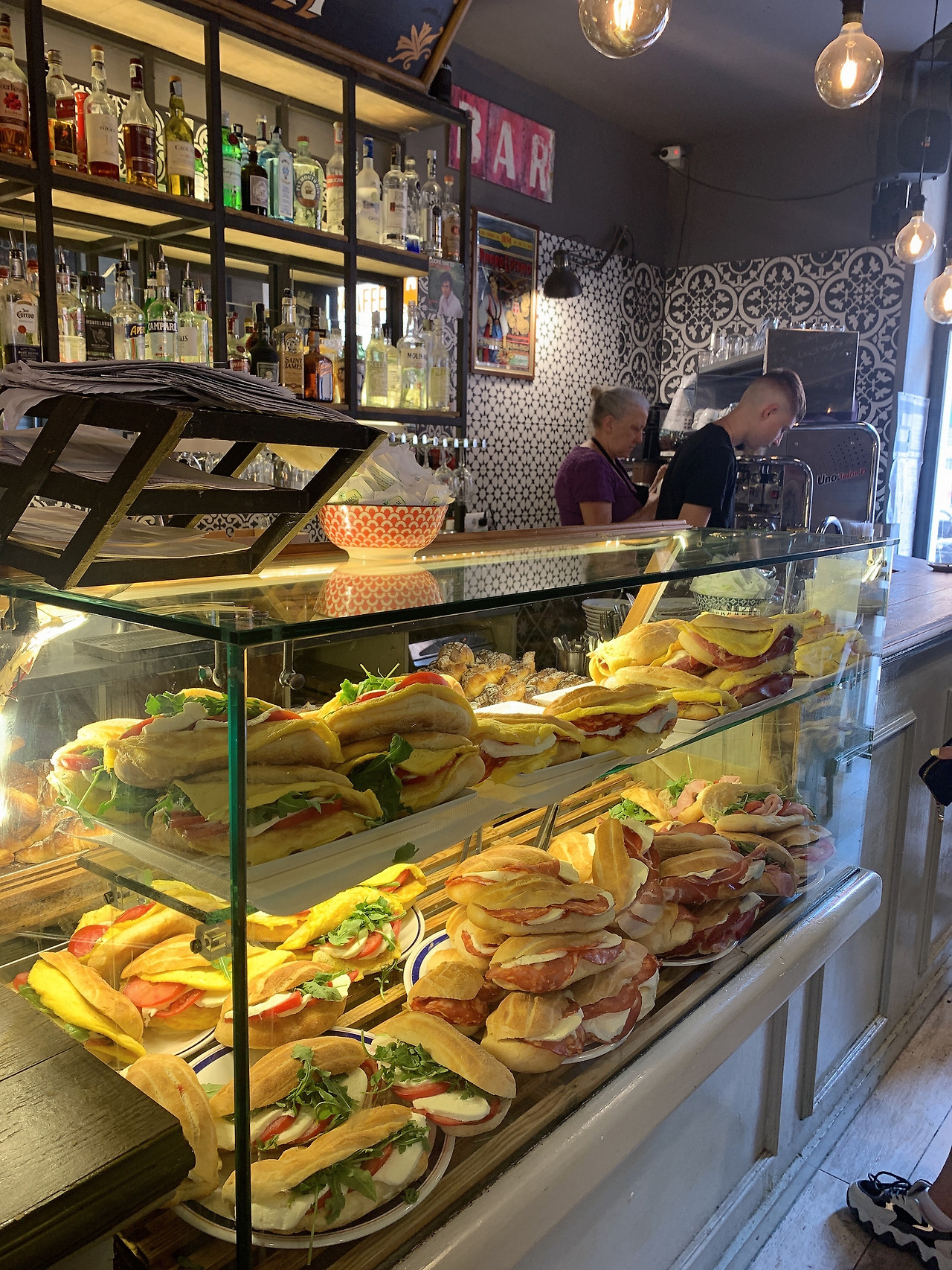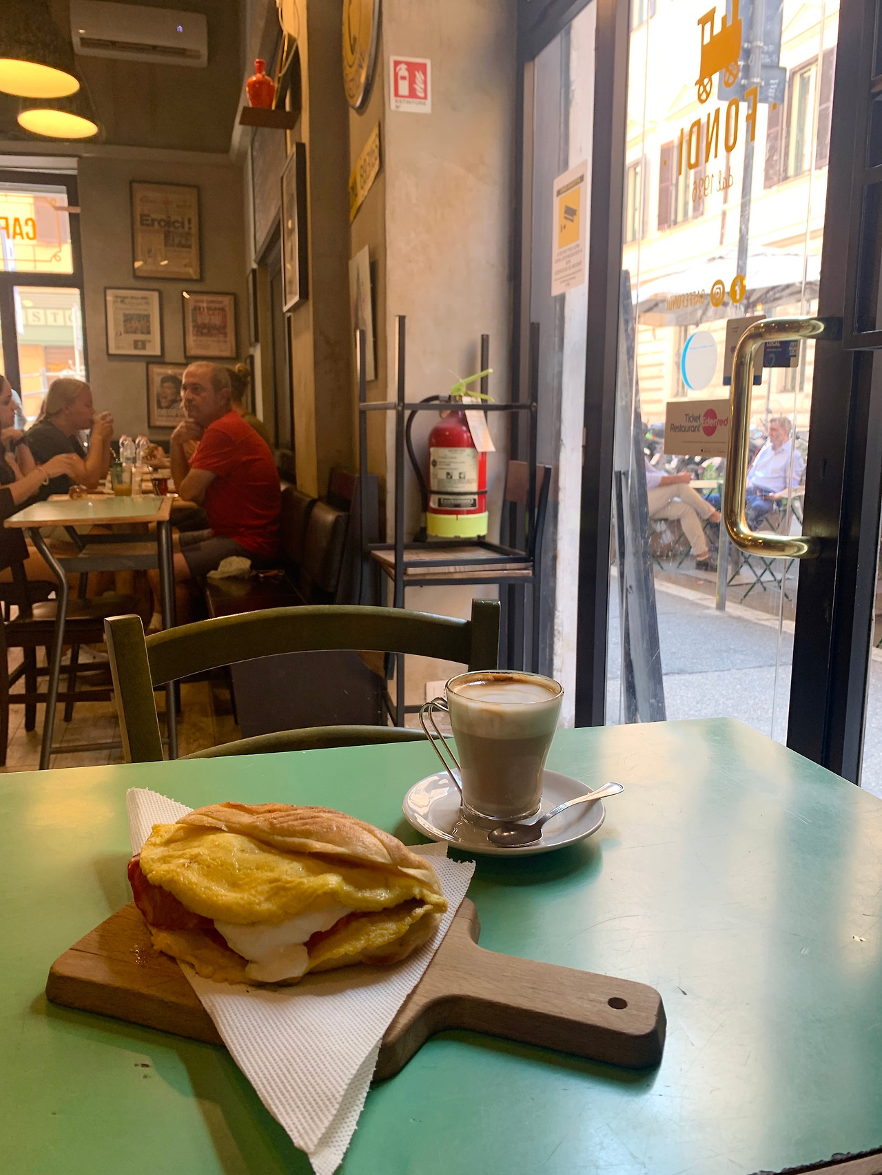 커피와 샌드위치를 들고 구석에 자리를 잡고 앉았다. 이탈리아 커피가 그렇게 맛있다던데! 유일하게 스타벅스를 찾아보기 힘든 나라, 아이스 아메리카노를 취급하지 않는 나라. (판매하는 매장도 종종 있었지만 대부분의 경우 찾기 어려웠다.) 나도 커피를 좋아하지만 처음부터 에스프레소를 시킬 염두가 나지 않아 주문한 라떼는 부드럽고 생각보다 연했다. 물론 맛있었다. 이 카페의 단골로 보이는 손님은 에스프레소를 들고 서서 그 자리에서 몇 모금 마시며 젊은 남자와 이런저런 얘기를 나누었다. 홀 담당으로 보이는 할아버지 직원은 테이블을 정리하고 바닥을 쓸고 문을 잡아주곤 했다. 카페에 머무르며 이탈리아의 문화 속으로 들어온 듯했다.